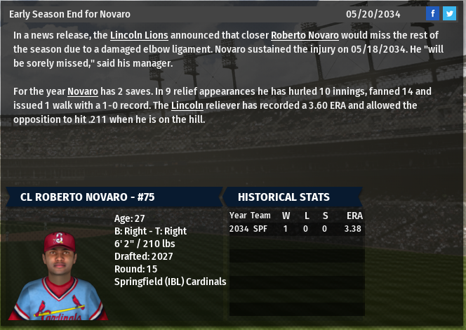 Isotopes Rf Evil Knievel has a 5 Hit game. Seattle loses SP Arthur Morgan for the season. Bird City loses RP David Passell for the season. Springfield loses CL Roberto Novaro for the season.