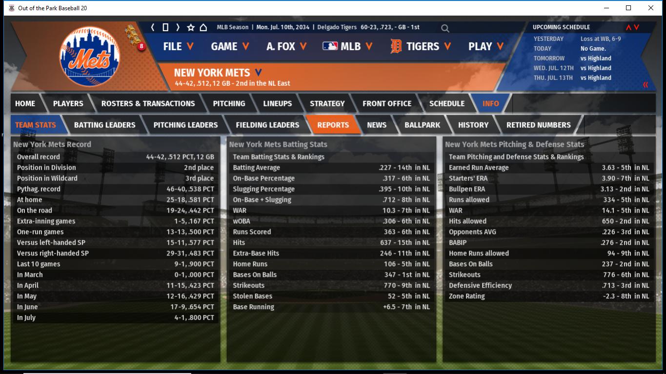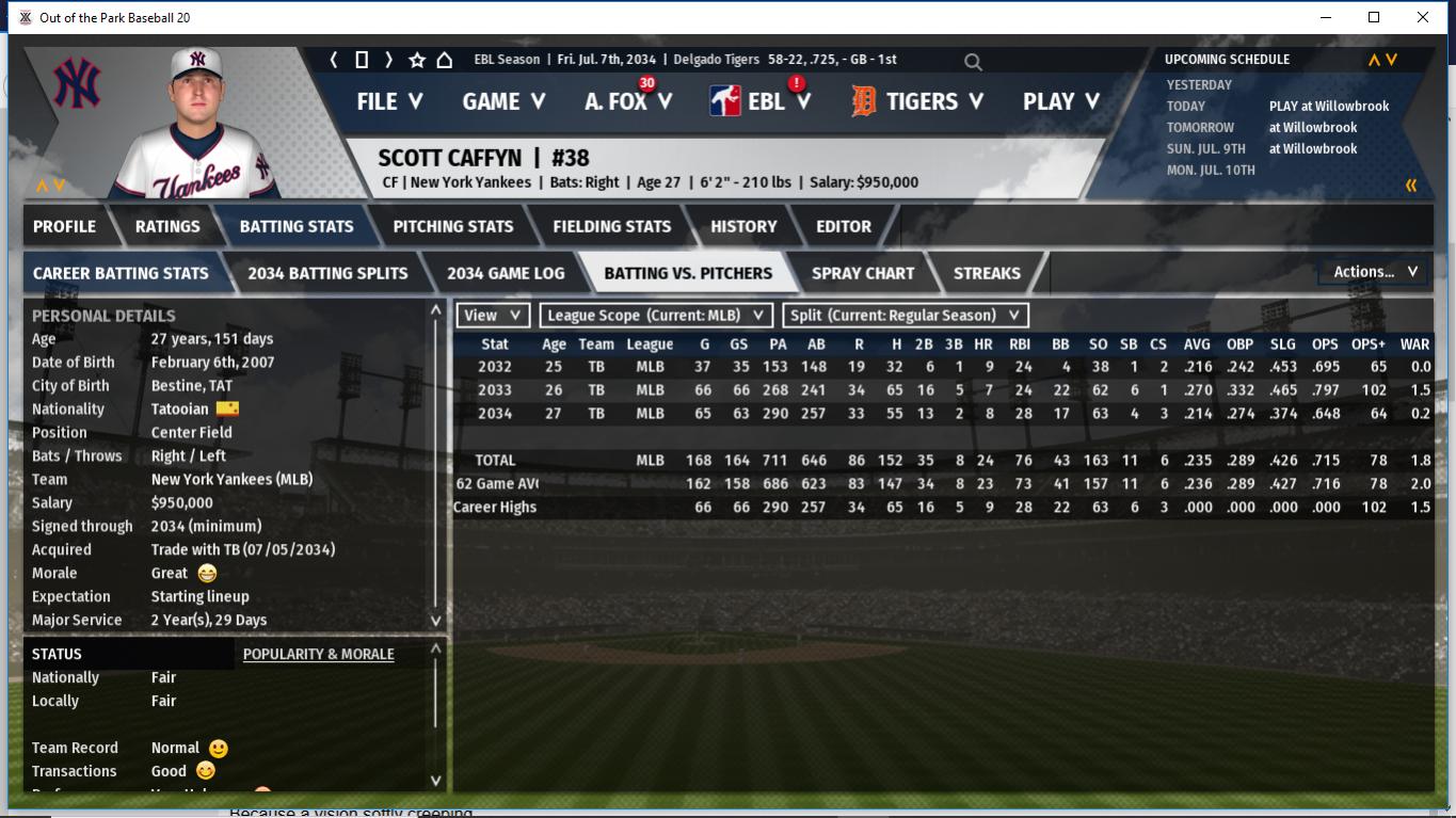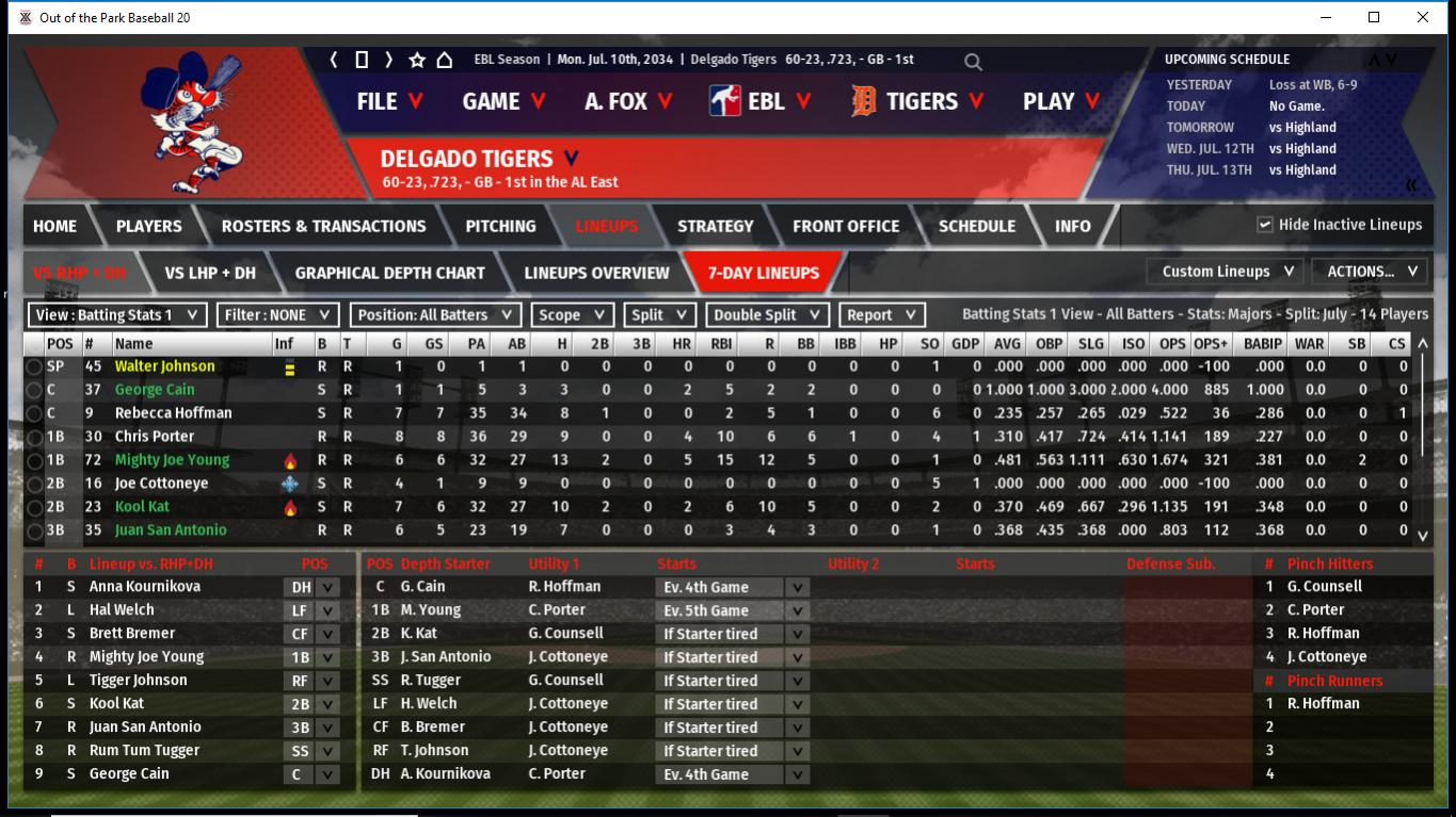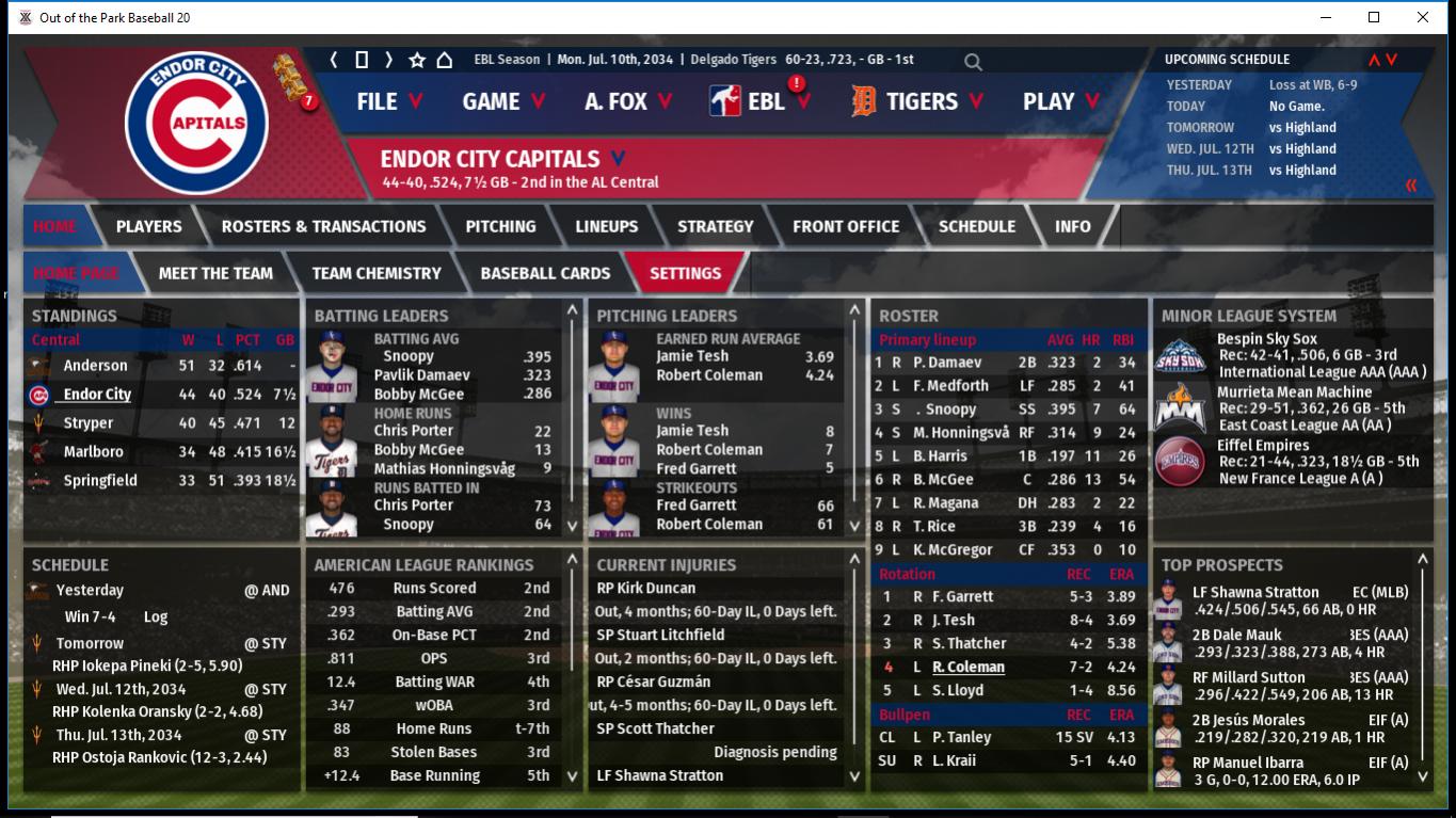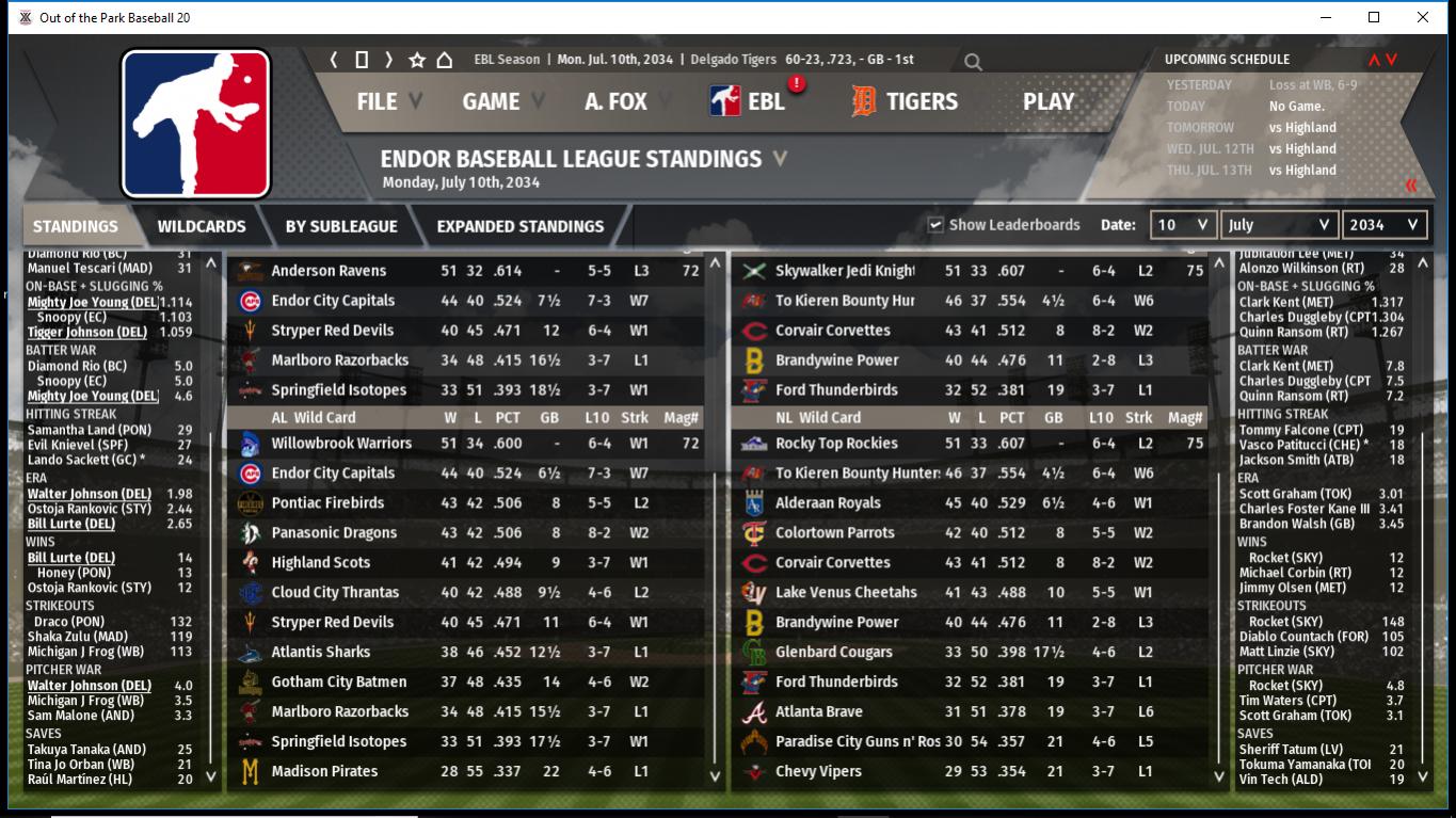 We are 3-4 vs the Warriors this season. The Warriors had a poor June but are having a great July riding a 5 game winning streak, We are also on a 5 game winning streak. While the Warriors have Black, Toro, Tam & Patty, their offense is near the bottom in the AL. If they add any offense to this team they can easily catch us again. Their pitching is amazing. Their pen is lights out. Braxton is having a great season. I hated to get rid of Bobby but he is a liability in the field and has too many slumps these days. Porter still gives us great leadership and is a future HOFer he is hitting .293 vs LHP this season and that our only weakness this season. He will start at DH vs LHP and platoon at DH/1b with Anna, Hal & Mighty Joe. I have the rotation set up with W. Johnson, Lurte & FW Johnson. All 3 pitch well vs Willowbrook.