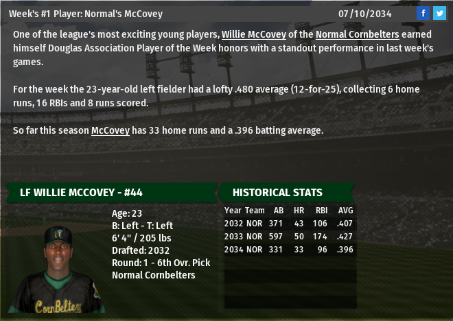 Fire Rf Chris Starr is named IBL LA POTW. Normal Lf Willie McCovey is named DA POTW. Pittsburgh loses SP Christian Alvarez for the season. Panasonic Dragons traded Rf Onofredo Chiappo to the Milwaukee Brewers for SP Ron Keirl and a minor league SS.