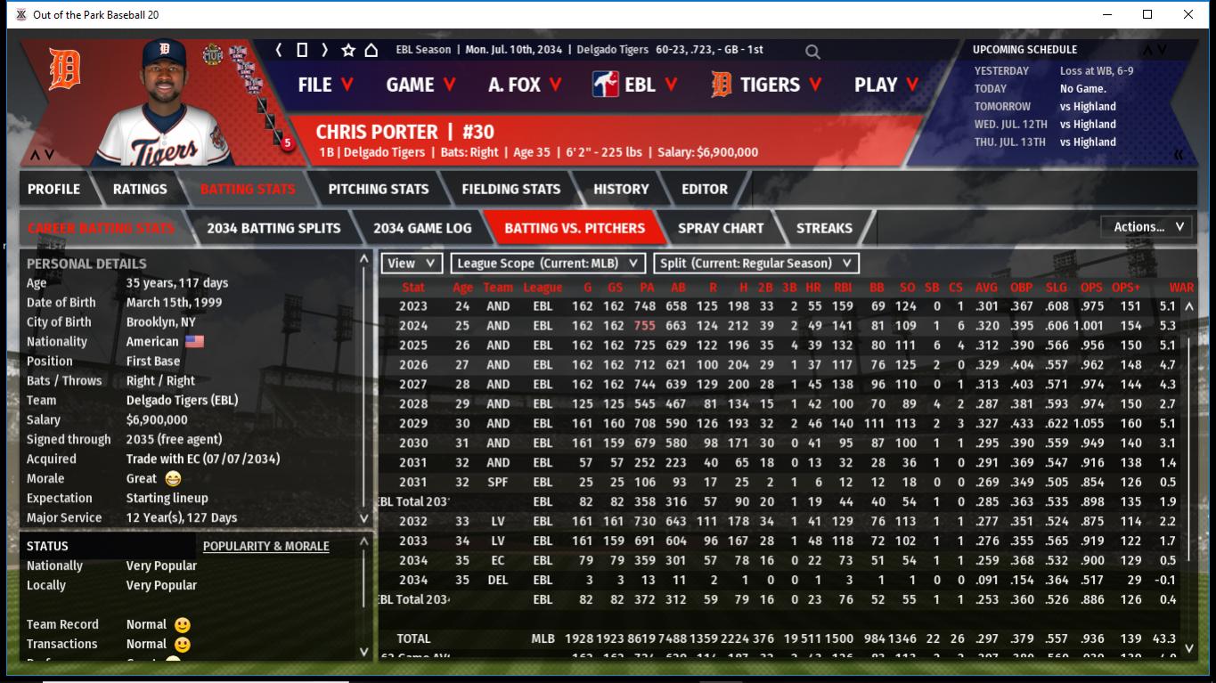 Rebecca, Joe & Anna have all struggled so far this month. I changed the lineup a bit. Brett has been great hitting 3rd, so hes there for now. Tigger has been solid when hitting 5th. Porter will platoon at 1b & DH vs RHP and start at DH vs LHP. Player Spotlight 1b/DH Chris Porter #30 Chris comes over from Endor City after spending most of his career with Anderson. He has over 500 HR and close to 2300 Hits. He is a 1st ballot HOFer. He can still get it down and is 3rd in the AL in RBI. He gives us a much needed high avg, mega power bat vs LHP. His leadership and experience will fit right in with Brett, Tigger & Juan.