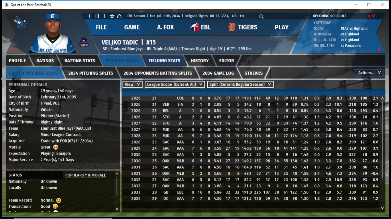 Trying to get Porter enough AB's to keep him happy might be difficult. I probably dont need him but trading him and a bullpen arm away for a prospect or a better bullpen arm should be easier than it would have been with Bobby. I'll miss Bobby. I drafted him in Ford, originally as a left handed throwing C but Juan stole C from him then I moved him to 1b. I made it a point to get him away from Brandywine when i came to Delgado in 2026. the Capitols fans will love him.