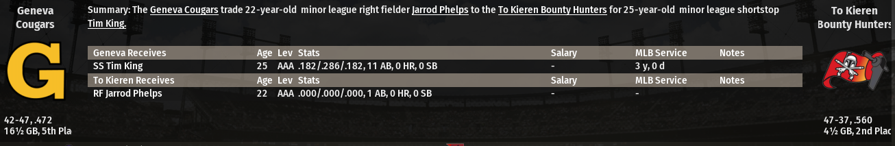 Geneva Cougars traded 3b Andy H'Jamler to the Colortown Parrots for Rf Paul Simmons & a minor league 2b.