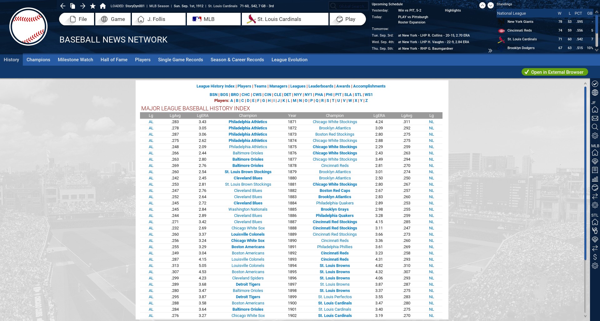 My longest save is now in its 42nd or 43rd season at this point, I believe, having started in 1871, and now being in 1912, if memory serves, and I created it in 18, for that matter. I went back to my latest backup for that dynasty, when things didn't go as expected around the end of the 1912 season, which is when the Federal League comes into the game.