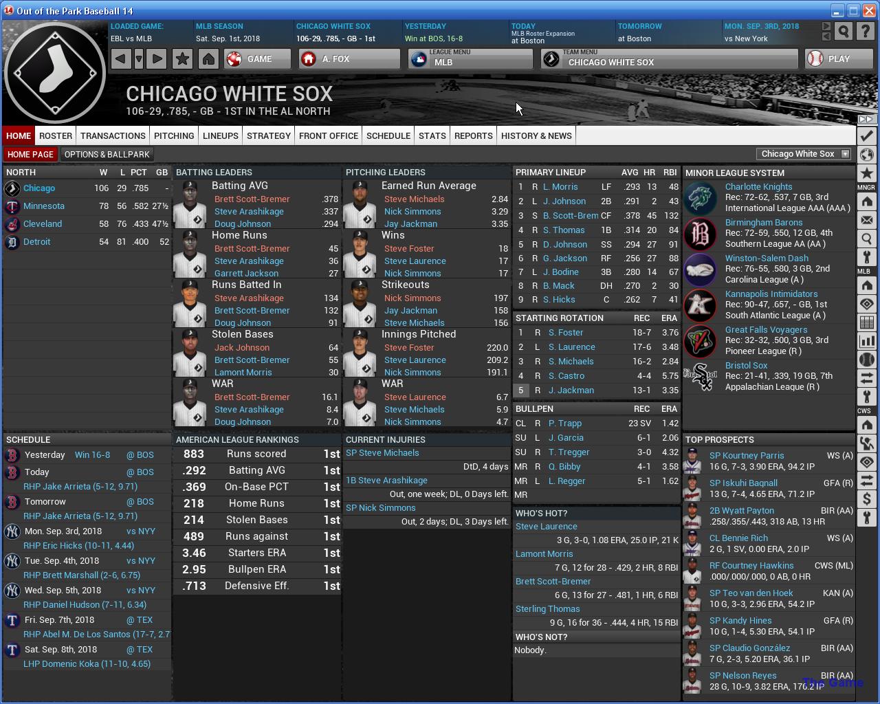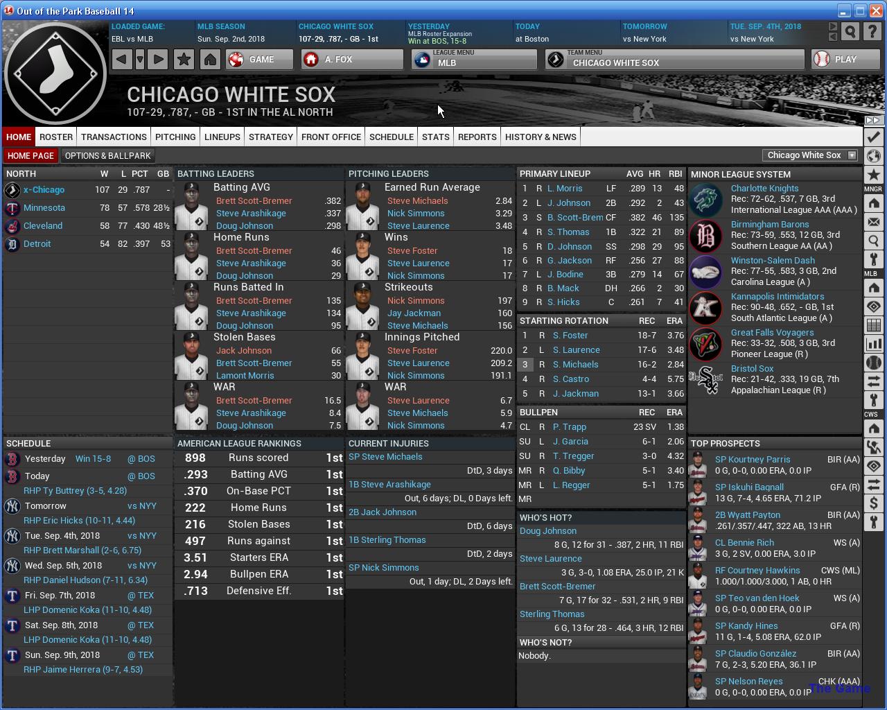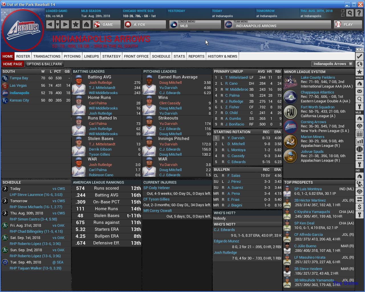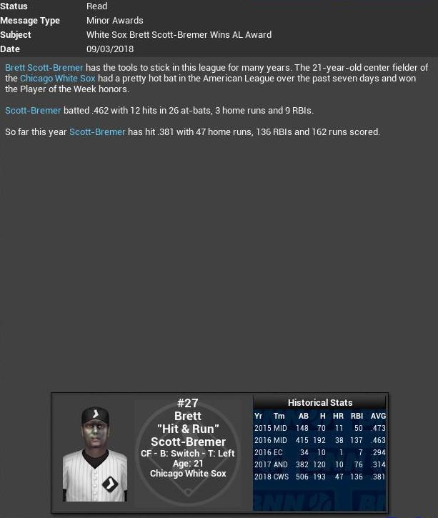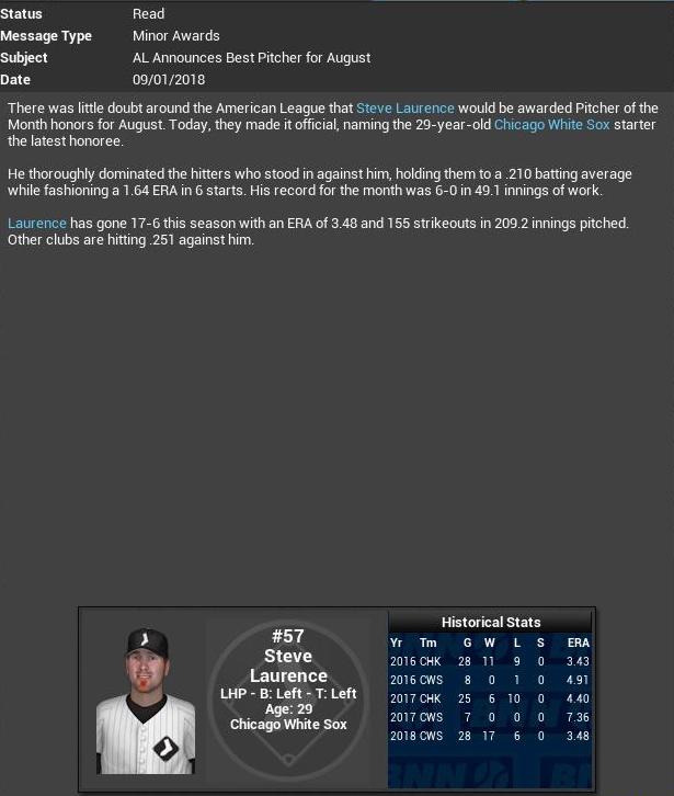 4-1 to end the month. We are a little banged up right now. Steve Michaels is DtD for 4 more days with a Finger Blister. No word yet on whether or not he will miss his next start. He probably will. Steve Arashikage should be back in a week. Nick Simmons should be back in 2 days and migth start in place of Michaels for a game, then bump Castro back to the pen. September will be a fairly easy month with plenty of bad teams like NYY, BOS, CLE, ANA & DET. September Call Ups: C L/R Jose Barrera .290 11 HR 36 RBI AAA. Played in MLB in 2017. great arm. IF L/R Wilbert Lewis .247 12 Hr 49 RBI AAA. Played 3 games for Baltimore in 2017. CF S/R Keenyn Walker .257 13 HR 38 RBI 35 SB AAA. 4 games with CWS this season. RF R/R Courtney Hawkins .270 23 HR 59 RBI 23 SB AAA. #99 Prospect MLB. RHP Zach Isler 12-8 2.98 172.1 IP 134 K 45 BB .279 BABIP AAA. 4 games in 2017 with CWS. RHP Chris Beck 10-6 3.52 156 IP 144 K 51 BB .260 BABIP AAA.
