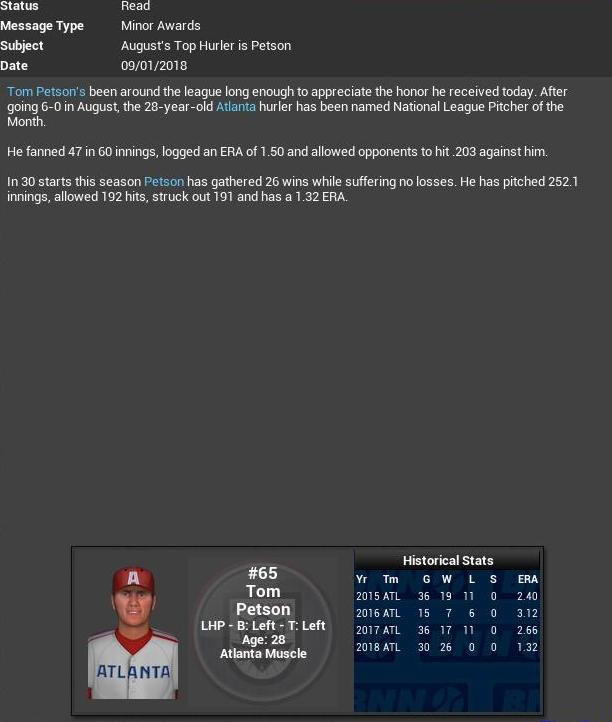 Cardinals RF Salas will be out for the rest of the season. Brett wins AL Player of the Month. Mets SS Eric Williams win NL Batter of the Month. Steve Laurence wins AL Pitcher of the Month. Tom Petson wins the EBL NL Pitcher of the Month.