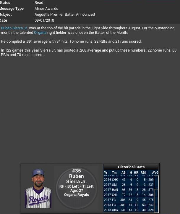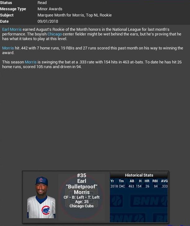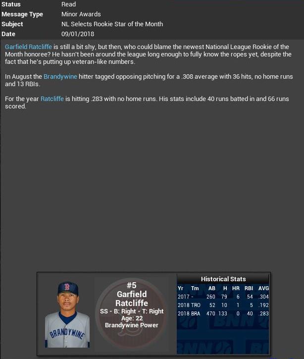 Brandywine SS Garfield Ratcliffe wins EBL NL Rookie of the Month. Yankees CF Anatoly Krimov wins AL Rookie Of The Month. Cubs CF Earl Morris wins NL Rookie Of The Month. Ruben Sierra Jr wins the CBF LS Batter of the Month.