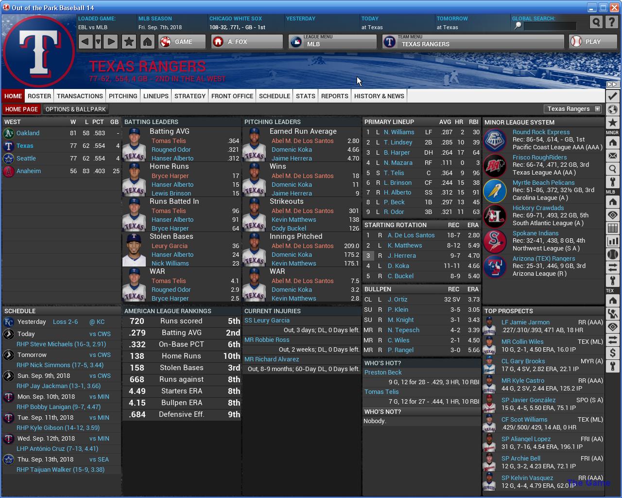 3 games @ Texas. See if we can help Oakland. We have been bad so far this month. Telis is having a MVP like season and De Los santos is a contender for the AL Cy Young.