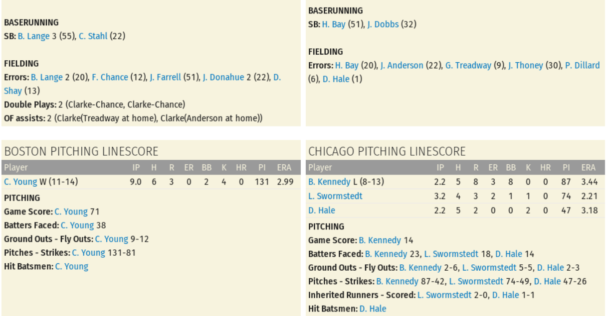 The venerable Cy Young (12-14) played well enough to secure the win, allowing 3 runs (2 earned) on 7 hits, 1 walk, and 1 wild pitch for the complete game 120-pitch effort; Game Score 65. Nixey Callahan (3-17) was tagged with the loss after allowing 4 runs (0 earned) on 8 hits, 1 walk, and 1 hit batsman; Game Score 59. Boston's offense was powered by Dave Brain (3 for 4, Double, Run, Stolen Base), Danny Shay (2 for 4, Run, RBI), and John Farrell (1 for 4, Double, Run, RBI). On the other side of the ledger, Charlie Hickman (3 for 4, Double, Run), Roger Bresnahan (1 for 4, Double, RBI), and Freddy Parent (1 for 4, Run, RBI, and Stolen Base) played well in the loss. Player of the Game: Cy Young (Season: #10 / Career: #42)