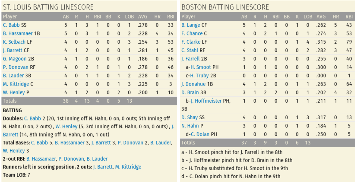 The winning pitcher on the day was Weldon Henley (15-14), who allowed 3 earned runs on 9 hits and 2 wild pitches; Game Score 63. Noodles Hahn (15-12) was tagged with the loss after he allowed 4 runs (3 earned) on 13 hits; Game Score 52. The Browns found success against Hahn, led by Charlie Babb (3 for 5, 2 Doubles, Run, RBI), Weldon Henley (2 for 4, Double, Run), Bill Hassamaer (3 for 5, RBI), and Jimmy Barrett (2 for 4, Double, Run). The Americans found help at the plate from Dave Brain (2 for 3, Homerun, Run, 2 RBIs), Jiggs Donahue (2 for 4, Double, Run), Frank Chance (2 for 4, RBI, 2 Stolen Bases), and Bill Lange (2 for 5, Run, 2 Stolen Bases). Player of the Game: Weldon Henley