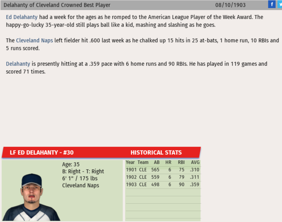 A familiar face takes home the American League Player of the Week award. In picking up his 4th PofW award of the season (and the 6th of his career), Big Ed Delahanty smacked the ball to the tune of a .600 batting average (15 for 25), with 6 Doubles, 1 Homerun, 5 Runs, 10 RBIs, and 2 Walks for a slash line of .600/.630/.960 which generated 1.0 WAR and 1.34 WPA. The Cleveland Naps outfielder is currently the overwhelming favorite to take home season MVP honors.