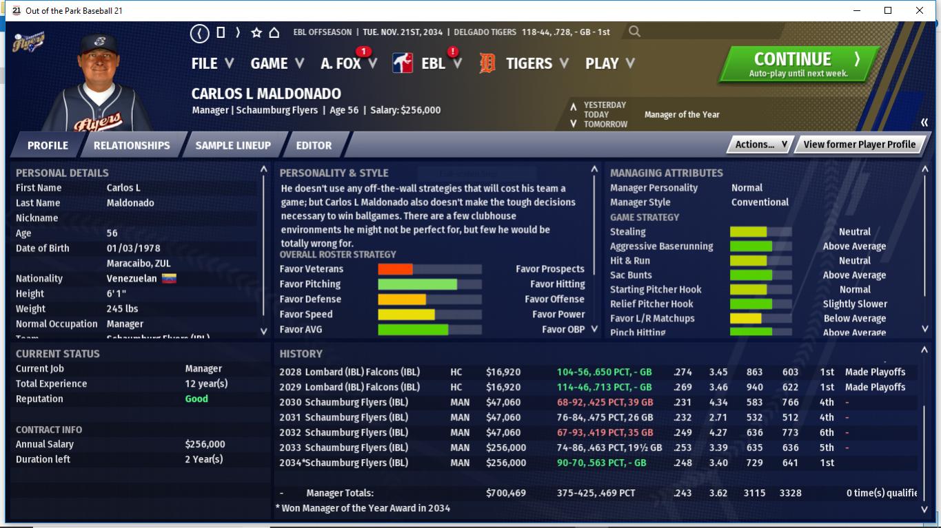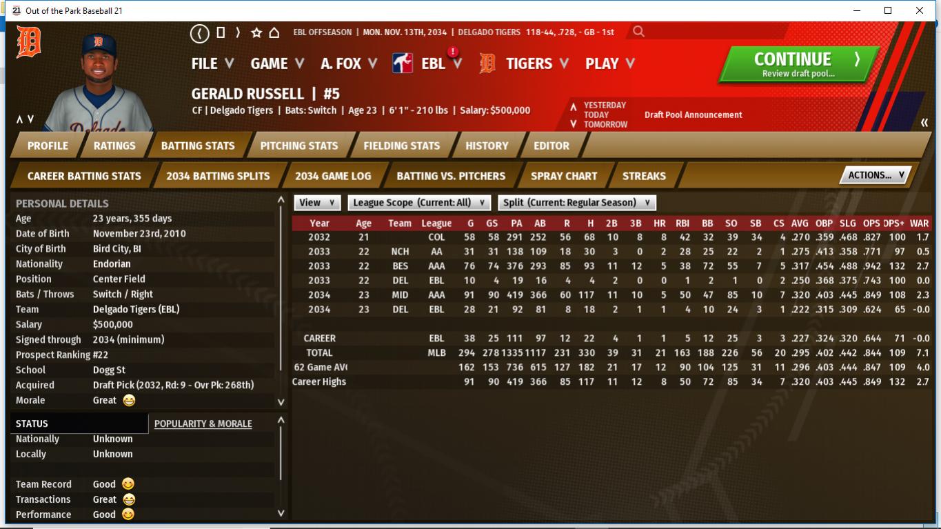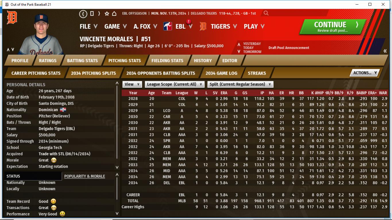 Joe had an off season this yeaqr. He is still the #1 option to play all 8 positions. He lacks power but is good on defense and has some speed. He enters the last year of his contract. SS/DH Greg Counsell S/R #46 Greg did ok after coming over from Havana. He did great vs LHP but his lack of power hurt the Tigers at times. I will not rule out bringing him back after FA but it's doubtful. RP Rooster Evans R/R #74 Rooster did great in his 1st full season. right now, he is more of a long relief but he could be a Closer at some point and could compete for teh SU role next season. RP Wrigley Field L/L #11 Wrigley at times was dominant but is prone to surrender a costly HR. He will be an integral piece of the bullpen in 2035. C Rebecca Hoffman S/R #9 Rebecca started out her rookie year on fire at one point stealing the starting job away from George Cain but she hit around .209 after July 15th. she will go into the 2035 season as the backup but could steal the starting job from him. she threw out close to 50% of the runners.