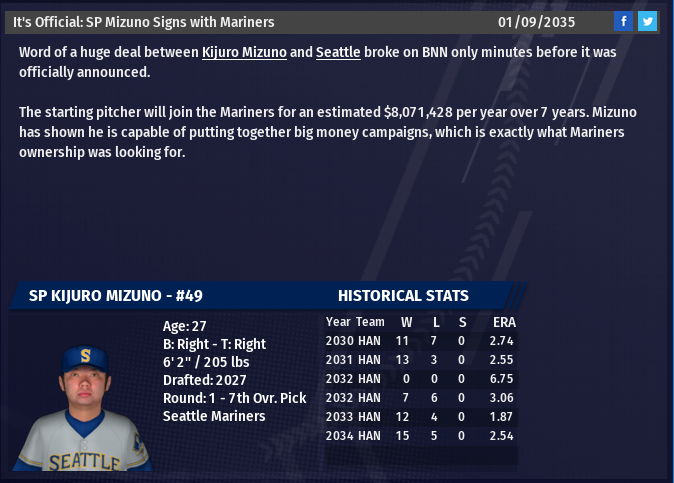 Seattle Mariners sign SP Kihuro Mizuno to a 7 yr deal. Coal City Coalers sign C Bryce Stevens to a 6 yr deal.