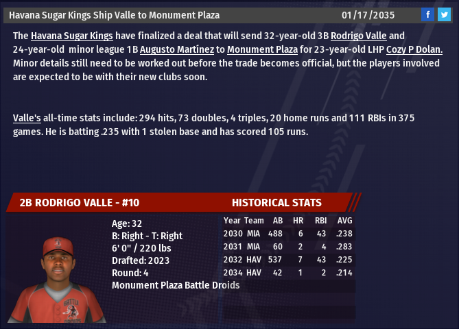 Havana Sugar Kings traded 3b Rodrigo Valle & a minor league 1b to the Monument Plaza Battle Droids for a minor league RP.