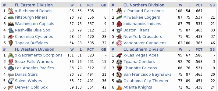 Portland Raccoons (108-54) vs. Las Vegas Aces (95-67) On paper, there was clear advantage for the Raccoons. They came in with the second-best regular season record the ABL had ever seen in their 20-year history, after the 1991 Capitals who went 113-49 to win the title. The Aces made their first ever playoff appearance in contrast to the seventh for the Raccoons. The Aces’ 770-687 runs scored/against became pale when compared to the Raccoons’ 840-608. The Raccoons were easily outscoring them and were allowing fewer runs. The Aces had also lost seven of the nine regular season games between the two teams. Yet, the Raccoons had stumbled during the final days of the regular season, losing four of their last seven games, and had struggled to score runs. Much was attributed to the fact that they had lost Royce Green to a torn labrum, and a .900+ OPS outfielder with good defense was not readily replaced by any team. The Aces were without infielders Steve Moore and Francisco Marino (not that they were regulars) as well as SP Raimundo Beato (elbow inflammation). It looked like the Raccoons had been hit harder with the injuries. “Pooky” Beato’s ERA this year had been north of six. The main factor in the outcome of this series would be whether the Aces’ pitching would hold up against the Raccoons’ offense which had scored more than five runs a game this year. That had been with Green, however, and Neil Reece, Vern Kinnear, and David Vinson had endured long slumps at the end of the year. Offensively the Aces were built around high on-base percentage and speed on the base paths as opposed to most of the Raccoons lineup, which consisted of home run hitters. Would the Raccoons break out of their slump? Then the series was theirs. But if they failed to hit the ball, the Aces would have a huge chance here after waiting for 20 years. --- I made a tough decision and left SP Miguel Lopez off the playoff roster. When Royce Green went down, we had had only 12 batters on the roster, and only Lopez came off the DL after September 1. Joe Lacombe was the only outfielder eligible in excess of the four that had been on the roster on August 31 and was added in place of Lopez. The reason is the following: Lopez is an infinitely better player than Lacombe, but we have only two right fielders without him. As things are, Scott Strong will start in right, but his defense is not great, and Lacombe could be a defensive substitution late in games. Apart from that there are no surprises on the roster. Oh yeah, the rotation. The next tough decision was who would pitch game 3 after Saito and Turner, who would start the first two games at home. Scott Wade was normally a sure #3 with Lopez not around, but he had been blown up excessively in September. Donis was unable to go six. Rivera had befuddled hitters all year. The next tough decision was to put Donis into the bullpen. If Wade was torn up, he could still start a game 6 or game 7. Unless we would go the Oklahoma way again. Then this would not matter. Next, Kisho Saito and the Furballs welcome the Aces in the Northwest.