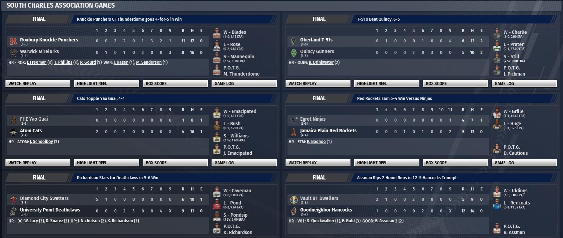 Yes, it is. There is still a lot (more) of baseball left, but hopefully there are actually some good league and association races. As far as the SCA is concerned, Oberland is too damn good. I don't know why they are far above everyone else in execution, but they have a 5-game lead only 14 games in. Oh well, on to the last game of the first league games of the season.