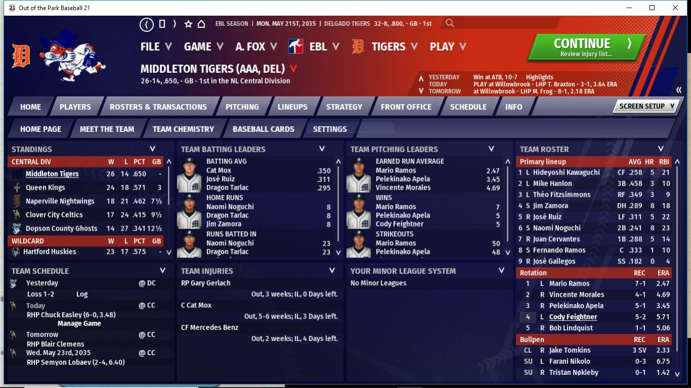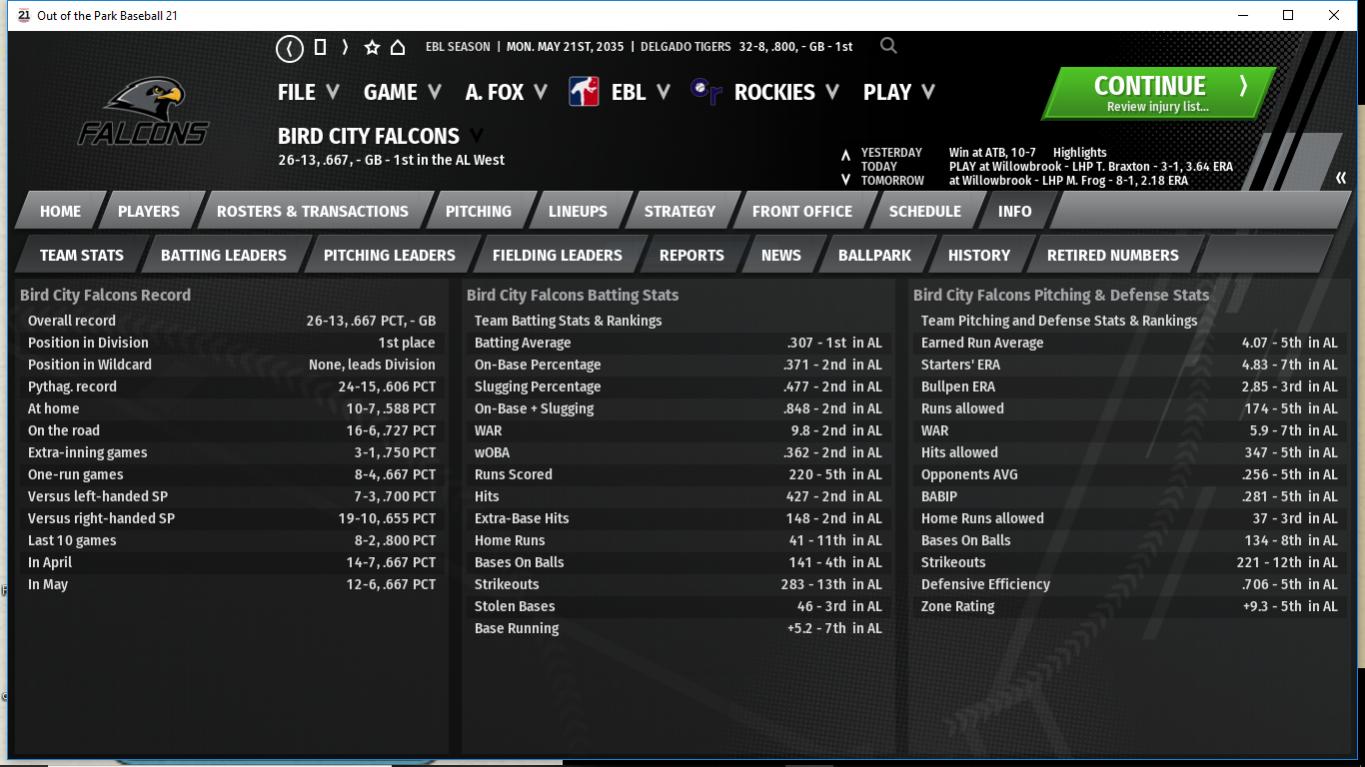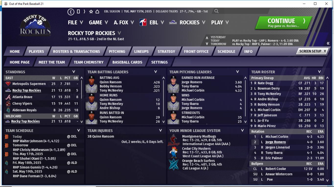 21-13 5 GB NL East. Going forward we will play 6 games per year vs our state rival, the Rocky Top Rockies. The Rockies are usually very good but struggle with pitchers in the thin air. They have a tremendous offense. They are led by 3b Quinn Ransom (IL), 1b Bowman Derry, Rf Tony McNeeley, Lf Andre Bishop & 2b bobby Henson. Their pitching is led by veteran Michael Corbin, Jorge Romero & CL Robert Cooke. New players: SP Jorgen Linnerud - an avg #5 but now as a #3. SP Tony Ibarra - a rookie that came over in the trade for Alonzo Wilkinson, who just won NL POTM. RP Kanzaburo Engel - a lights out LHP SU RP Poe - formerly a CL now in a MR/SU role RP Anwar Wintercorn - Also formerly a CL now a MR/SU giving them 4 great LHP bullpen pitchers. Rf Tony McNeeley - a great all around Rf replaces the aging Matt Young in Rf. 1b Forat Argote - a solid rookie 1b with good pop. C Jeff Jameson - a veteran C with a great arm. 3b Ju-il Yu - a rookie 3b filling in til Quinn comes back. SS Mario Perez - a very good defensive SS that came in the Wilkinson trade. 2b Billy Ivey - a good rookie bench player SS Roque Delgado - a speedy defensive rookie SS.