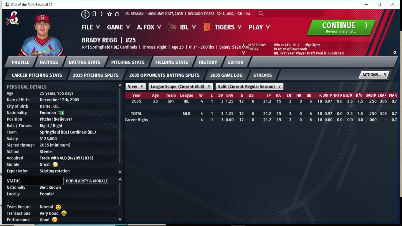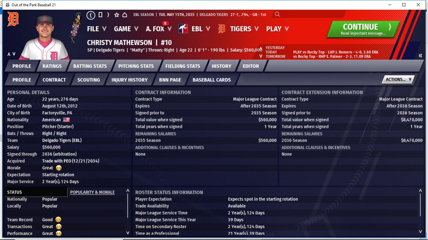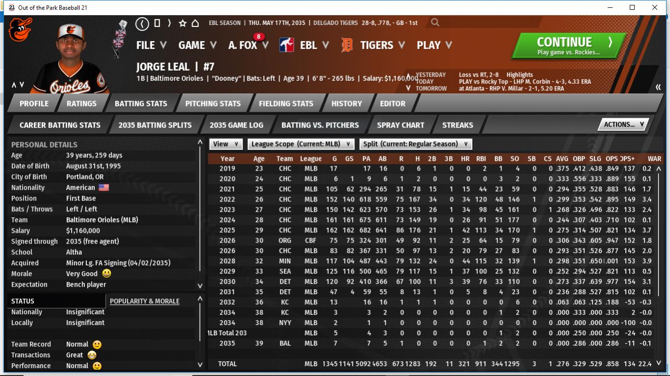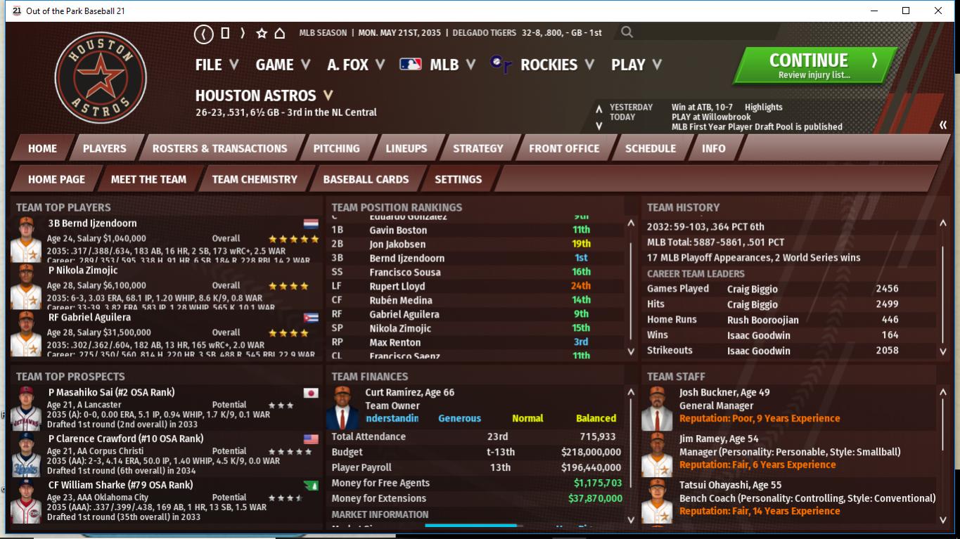 21-13 5 GB NL East. Going forward we will play 6 games per year vs our state rival, the Rocky Top Rockies. The Rockies are usually very good but struggle with pitchers in the thin air. They have a tremendous offense. They are led by 3b Quinn Ransom (IL), 1b Bowman Derry, Rf Tony McNeeley, Lf Andre Bishop & 2b bobby Henson. Their pitching is led by veteran Michael Corbin, Jorge Romero & CL Robert Cooke. New players: SP Jorgen Linnerud - an avg #5 but now as a #3. SP Tony Ibarra - a rookie that came over in the trade for Alonzo Wilkinson, who just won NL POTM. RP Kanzaburo Engel - a lights out LHP SU RP Poe - formerly a CL now in a MR/SU role RP Anwar Wintercorn - Also formerly a CL now a MR/SU giving them 4 great LHP bullpen pitchers. Rf Tony McNeeley - a great all around Rf replaces the aging Matt Young in Rf. 1b Forat Argote - a solid rookie 1b with good pop. C Jeff Jameson - a veteran C with a great arm. 3b Ju-il Yu - a rookie 3b filling in til Quinn comes back. SS Mario Perez - a very good defensive SS that came in the Wilkinson trade. 2b Billy Ivey - a good rookie bench player SS Roque Delgado - a speedy defensive rookie SS.