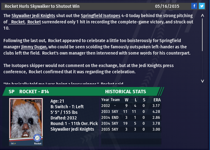 Skywalker SP Rocket pitched a 1 H 10 K CG SH. Mets lose SP Jim Peters for the season. Cubs lose SP Gilbert Ewijk for the season. Baltimore 1b Jorge Leal will retire after the season.