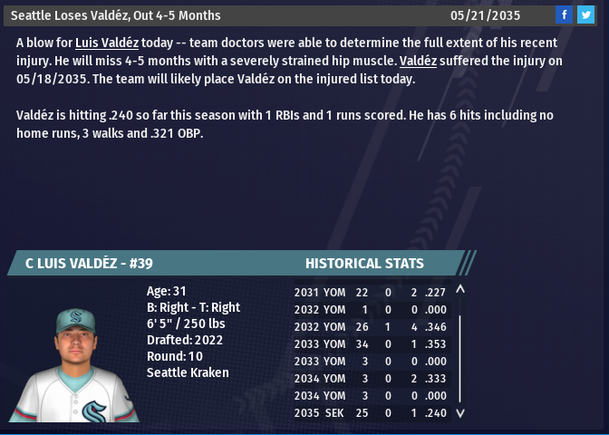 25-15 7 GB We are 3-0 vs the Warriors this season. We will play shorthanded until we find out if Tigger Johnson will miss some time or not. If he goes onto the IL Jose Ruiz will come up. Mighty Joe will play Rf often along with Russell. Joe Cottoneye will play 1b on occasion. More on that later on. Thus far the Warriors have been great. They have been positioned as the AL Wildcard for awhile now. Historically, we are terrible vs them. So being down a great Rf and a star RP is going to put us at a bigger disadvantage. Thankfully we still have a 7 game lead and we play Atlantis next then Stryper. The Warriors are having great performances from Black, Miller, Frog, Braxton, Self, Orban, Smith & Dostie.