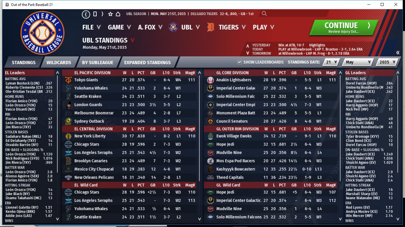 Liberty have a 2 game lead. Stars & Seraphs are the EL WC. Lightsabers cling to a 1 game lead. Ewoks have a 2.5 game lead. Jedi & Galactic Alliance are the CL WC.