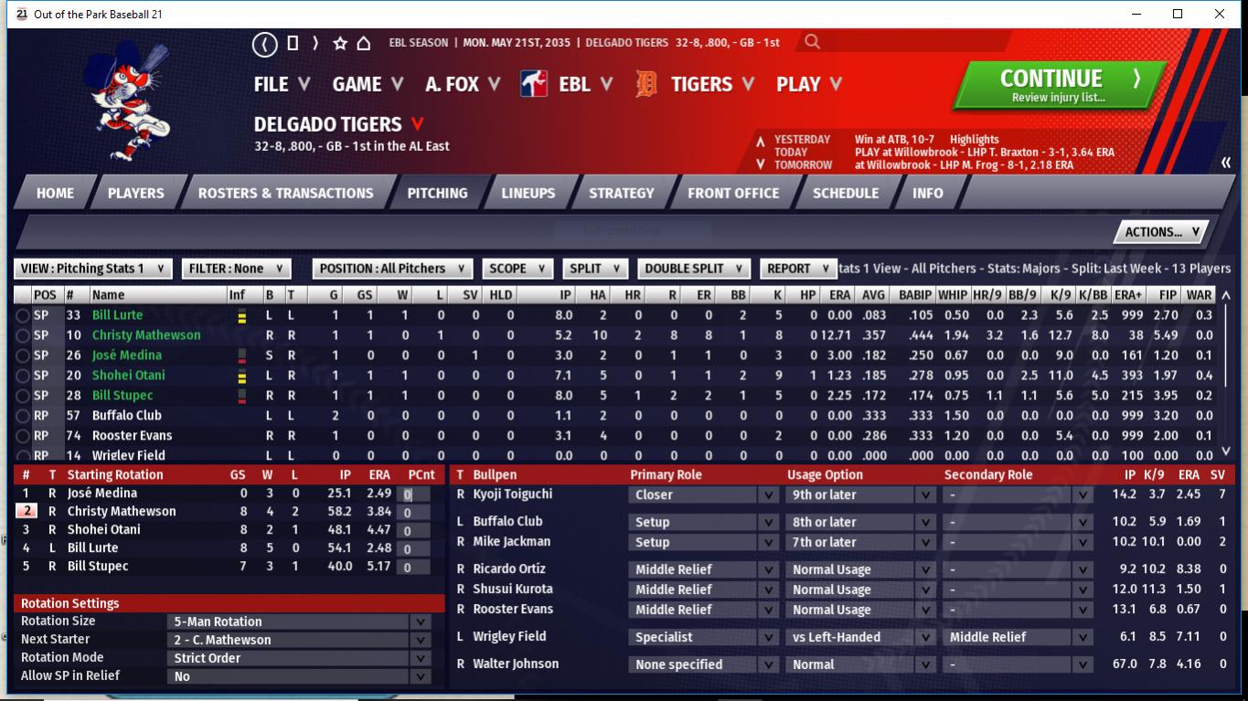 Great week despite the 11 game winning streak ending. 16-2 so far in May is great but now thing get complicated. 4 games @ WB then 3 vs ATS. Walter Johnson will miss his next start, Jose Medina will start in his place. Tigger Johnson has a pending injury. If he goes on the IL Jose Ruiz will be called up. Overall the rotation was strong last week. Christy got shelled for the 1st time. Club, Toiguchi & Ortiz struggled.