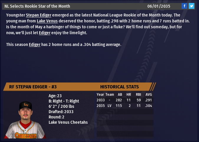 Not a bad month even without 2 of our best stars, although we did struggle a little bit without them. June has 17 Road games vs 10 Home games. Not a bad month other than the Road games but we are 10-4 on the road. The 1st 6 games will be tough even though Anderson is struggling a bit right now. Atlantis on the road is a toss up whether it will be tough or easy. Gotham City at home for 3 and they are hovering around .500. Willowbrook split the last series with us, but they are not as good as lat season. Then we have 9 games in a row vs sub .500 teams in Panasonic, Cloud City & Springfield. Then we finish the month up with 2 games @ Pontiac. they are competing for the Wildcard. Hoping for a 18-9 record. Overall the rotation has been good but has struggled a bit this week. Club, Evans & Field have been solid.