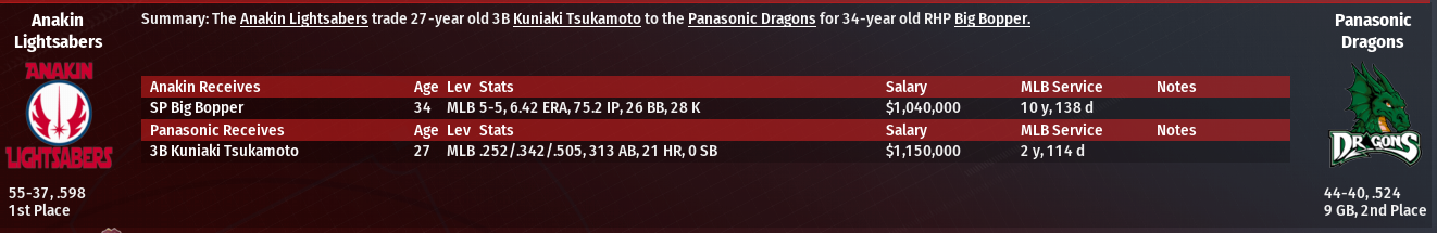 Anakin Lightsabers traded 3b Kuniaki Tsukamoto to the Panasonic Dragons for RP Big Bopper.
