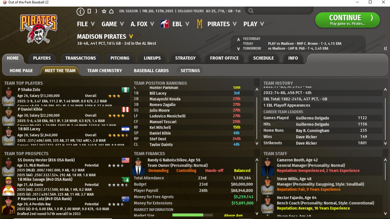 38-48 16.5 GB AL West this is the 1st time we will see the Pirates this season. They have good young talent but lack the veterans to put it all together. Zulu is a veteran but his skill is not once it once was. Lacey leads the offense. new additions: 2b Masayoshi Kouda - decent gap hitter but struggling this year. SS Donny Hester - a good defensive rookie SS. Probably wont hit for AVG. Lf Tariq Azziz - a good power low AVG hitter Lf Lodovico menichelli - decent speed corner OF