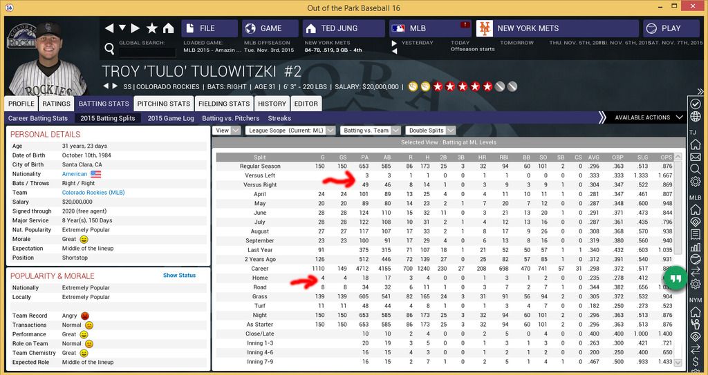 In each player's profile stat page, when clicking through to the Batting Splits menu. Some stats seem to not be compiled correctly. For example, Home and Road splits, it doesn't seem to account for all the at-bats (only a few at-bats, what happened to the rest of them?) Also, Versus Left and Versus Right splits, it's only a small fraction of the player's total at-bats (what happened to the rest?) There could be more missing, but I haven't checked. Just to be clear, I'm talking about the Batting Split Tab next to the "Career Batting Stats tab" (not the view pull-up menu batting splits). ![]() This is for version 16.3.16 Last edited by Mets Man; 04-11-2015 at 10:30 AM. |