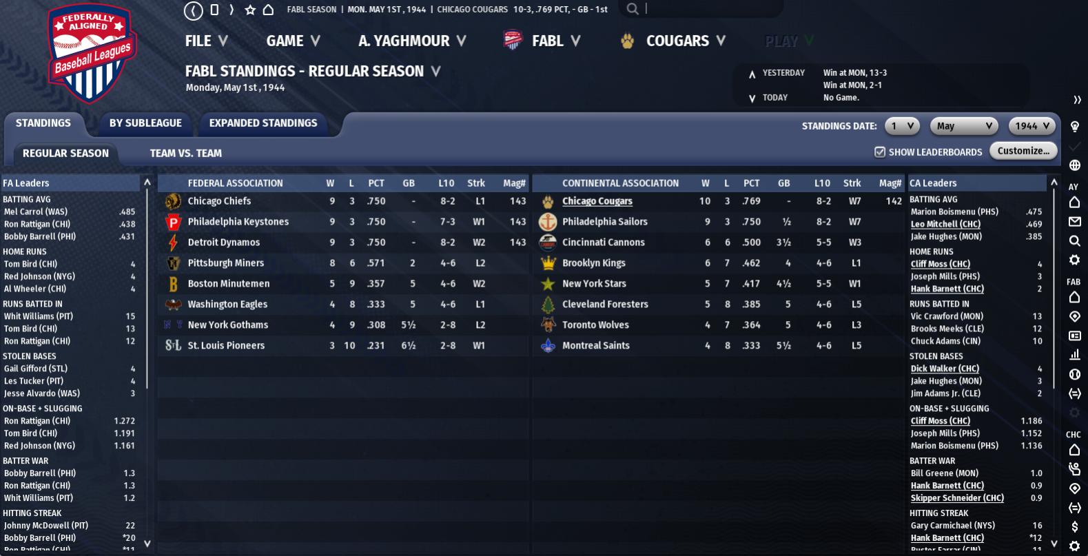 Seasonal Record: 19-6 (1st, 5 GA) Stars of the Week Leo Mitchell : 25 AB, 10 H, 1 HR, 6 RBI, .400 AVG, 1.023 OPS Harry Mead : 18 AB, 8 H, 0 HR, 2 RBI, .444 AVG, 1.085 OPS Dick Walker : 21 AB, 7 H, 0 HR, 2 RBI, .333 AVG, .976 OPS Schedule 5-10: Loss at Wolves (0-2) 5-11: Win at Wolves (4-2) 5-12: Win at Wolves (5-4): 10 innings 5-13: Win at Wolves (4-3) 5-14: Loss at Cannons (1-2): 11 innings 5-14: Win at Cannons (8-4) Recap Another good week for the Cougars, as we've now managed to lose 3, 0, 1, and 2 games in a week. I'd prefer these are the only numbers we see in the loss column the rest of the year, but I know far too well that a 4 or even a 5 is right around the corner. I'm not too sure when we decided winning one run games was cool, but we won our first seven before dropping the first game of the double header in Cincinnati 2-1 in 11. We took game two, and three of four in Toronto, to give us a nice 5 game lead over the rest of the pack. It's still early, and a lot can change, but it's hard to ask for a better start. It's also hard to ask for a better start then the one Leo Mitchell is having, as the star left fielder went 10-for-25 with 2 doubles, a homer, walk, steal, 5 runs, and 6 RBIs with only one additional strike out. This actually dropped his batting average to a still league high .465, and he had a multi hit game in five of our six games this week. The rest of the offense didn't provide much, as expected against two top staffs on the road, but Harry Mead stayed hot, going 8-for-18 with a walk and 3 more doubles. Mead is now hitting .337/.387/.477 (147 OPS+) in his first 93 trips to the plate this season, far closer to his impressive 1942 (identical 145 WRC+) then his disappointing 1943. Dick Walker walked 7 more times, going 7-for-21 with a double, triple, 2 steals, 3 runs, and 2 RBIs. He's no longer on track for 200+ walks, just 197, but he did strike out three times against the Cannons (who ironically only struck out him and Orlin Yates) in the second game of the double header. Cliff Moss was the only other hitter with an above average week, as the vet went 3-for-13, but with 4 walks, 3 runs, 2 RBIs, and his tied for league best fifth home run. Moss is on pace for 31, which would easily surpass his career best 26 he managed in the cavernous Parc Cartier back in 1930. Looking at his platoon counterpart Rich Langton, who was excellent last week, wasn't as lucky this week. The 32-year-old failed to get a hit in 10 PAs, walking and scoring once while stealing his second base of the year. Billy Hunter has stayed healthy, but endured another bad week, going 3-for-15 with a walk and three strikeouts. Jimmie James, who gives him the occasional off day, didn't fair much better, just 2-for-8 but with no walks, runs, RBIs, or extra base hits. The good news is Hunter is healthy, and while his .225/.269/.366 (81 OPS+) line leaves plenty to be desired, he's played above average defense at second and has a pair of longballs. With the overall firepower in the lineup, we can survive if a few guys have down weeks, and it's even more excusable when they're contributing to the #1 defense in the Continental Association. Our rotation was impressive this week, with only one pitcher giving up more then two earned runs. That was Rusty Petrick, of course, but the performance looked far better then the numbers imply. In the first eight innings Petrick allowed just 3 hits and 2 walks with 5 strikeouts. Then it unraveled a bit in the ninth, when his former team finally got to him for 3 hits, 4 walks, and 4 runs before he finally got the 27th out. It was Petrick's first win as a Cougar, and definitely an encouraging sign from the 28-year-old who has shown no issue wracking up his pitch count. He tossed one of our two complete games, the other going to Art White, who improved to a perfect 5-0 with a win over the Wolves. White allowed 7 hits and 3 runs (2 earned) with a walk and strikeout. The craft veteran Dick Lyons picked up another win, going 7 with 5 hits and 2 runs without a walk or strikeout. His home run troubles continued, as Lyons surrendered the only homer of the week and his third in four starts. He allowed 3 all of last season, and has somehow managed to create just 8 balls that didn't end up in play. 5 of his 11 runs this season have come from the longball, and he's already matched his homer total from 203.2 innings last year. Harry Parker through a season high 121 pitches, but he had to leave a 4-2 game with two outs in the 8th. It really should have been 2-2, but a Billy Hunter error cost him two runs, It was his worst start of the season, allowing 9 hits and 4 walks with just one strikeout. Ben Curtin finished the game, and it took 10, as we scored 2 in the 9th and 1 in the 10th. He threw 2.1 innings, allowing just a hit and walk to improve to an impressive 4-0 on the season. Curtin made two more appearances, picking up a save in Toronto while blowing one in Cincy. He finished the week with 6 innings, 5 hits, a run, 3 walks, and a strikeout. The 38-year-old stopper has been outstanding, with a miniscule 0.96 ERA (358 ERA+) and 0.91 WHIP in 18.2 dominant innings. Our pen had trouble this week, most of which can be blamed on Mike Murphy leaving the first game of the double header in the 3rd with back stiffness. He won't have to miss a start, which is good, and Cal Knight did a great job mopping up. He went 5 innings with 3 hits, a walk, and 4 strikeouts. Curtin then allowed the game tieing run in the 9th, and then the Cannons walked off Merritt Thomas in the 11th. He allowed a hit, walk, and run with a strikeout in 1.2 innings pitched. We did a good job keeping runs of the board, but we have another week of tough road games ahead of us. Looking Ahead After splitting the double header with the Cannons, we get two more in Cincy. After getting swept by the Stars, they've fallen to third, now 13-11 and 5.5 games out of first. There is a lot of options for pitchers to start the series, but I t
