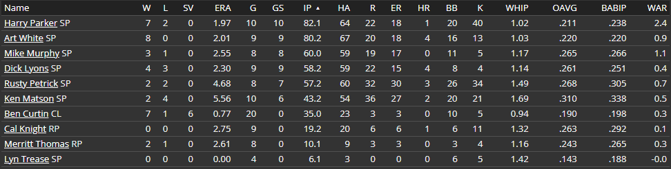 Seasonal Record: 28-12 (1st, 4 GA) Stars of the Week Hank Barnett : 28 AB, 13 H, 0 HR, 5 RBI, .464 AVG, 1.090 OPS Art White : 2 Wins, 18.0 IP, 3 BB, 4 K, 1.00 ERA Leo Mitchell : 29 AB, 12 H, 0 HR, 3 RBI, .414 AVG, .931 OPS Schedule 5-23: Win vs Saints (0-2) 5-24: Loss vs Wolves (3-1) 5-25: Win vs Wolves (8-9): 10 innings 5-26: Loss vs Wolves (6-2) 5-27: Loss vs Foresters (4-1) 5-28: Win vs Foresters (3-4) 5-28: Win vs Foresters (0-2) Recap We are starting to cool off a bit, but it's a fifth straight week above .500 and we have still yet to lose more then 3 games in a week. I think part of our cooling down has more to do with how hot the Wolves have been, as we snapped their 10 win streak but they took two of three in Chicago while outscoring us 17-12. We won the single game against the Saints and flipped the script on the Foresters, losing the lone game before winning the double header. We do have another game left in that series, so a series win has not been secured, but as usual, I like our chances. As good as guys like Hank Barnett and Leo Mitchell were, this week was all about Art White, who has had as good of start as anyone this season. White started the week against the Saints and ended the week against the Foresters, winning both games to improve to a perfect 7-0 on the season. He was almost perfect against Montreal, tossing a 3-hit shutout with a walk and 3 strikeouts, and then White picked up a second complete game win with 7 hits, 3 runs (2 earned), 2 walks, and a strikeout. We have won all eight of White's starts, as he's worked to an impeccable 2.13 ERA (162 ERA+) and 1.07 WHIP despite just 13 strikeouts in 71.2 innings pitched. Only Toronto's Bernie Johnson (1.45) has a lower ERA out of CA pitchers, but our veteran lefty leads the circuit in wins. He's probably been a bit lucky, as evidenced by his 102 FIP-, but White does an excellent job keeping runners off base, and he's an expert double play roller. With a lot of time left in the season and potential issues with Harry Parker's endurance, Art is going to be crucial in our pennant push, and we may have to ride him a bit harder at the end. White may have had the better week, but Hank Barnett was named Player of the Week for the second the straight week. Our talented slugger went 13-for-28 with 4 doubles, 4 runs, and 5 RBIs, so it looks like a 4 homer week isn't the only way to secure accolades. Barnett is now riding an 18-game hit streak, the highest active streak in the league, which has propelled his season line to .362/.421/.550 (178 OPS+) with 10 doubles, 6 homers, and 30 RBIs. I'm not sure who deserves the Whitney more, him or Leo Mitchell, as both continue to put up elite week after week. Mitchell continued to perform, going 12-for-29 with 3 doubles and 3 RBIs. His .425 average is the highest in the CA, and the next closest player in either circuit is Ron Rattigan's .401. We also got a good week from Skipper, who was 7-for-20 with with a double, RBI, 2 walks, and 3 runs scored. Barnett, Mitchell, and Skipper currently rank 1-2-3 in the CA for positional WAR, giving us far and away the most valuable lineup in the Continental Association. Despite the production from the trio above, the rest of the lineup had some issue, and the closest thing to average production we got was from Harry Mead. He was just 6-for-22, but Mead hit his first homer of the season. Cliff Moss finally came back down to earth, hitting just 2-for-19 with 3 walks. Billy Hunter had similar struggles, 2-for-17 with a walk and a run. His second base counterpart Jimmie James was just 1-for-8 with a run and walk. Dick Walker walked just 5 times, and was 4-for-27 with a double, homer, steal, and 5 runs scored. Orlin Yates had more of the same, 6-for-27 with a double, 2 walks, 2 runs, and 5 RBIs. It was impressive we still won four games with so many players underperforming, but the Wolves pitching staff is really good, and we had to deal with Bernie Johnson. Harry Parker will want to avoid Johnny Slaney and the Foresters, as his second loss of the season once again came at Slaney's arm. Parker again allowed 4 runs in 8 innings, this time with 10 hits, 2 walks, and 3 strikeouts. He has yet to allow more then two runs against any team other then the Foresters, and they have inflated his ERA and WHIP to 2.43 (142 ERA+) and 1.11. Mike Murphy also had a rough start, 12 hits, 6 runs (5 earned), a walk, and a strikeout in his first loss of the season. Ken Matson was a bit unlucky, although we still won the game, allowing 8 hits and 7 runs with 3 walks and a strikeout in 4.1 innings pitched. Only one of those runs were earned, as the Wolves got six in the first inning after a Skipper Schneider error. Dick Lyons turned the clock back a bit, with a pair of solid starts. He did lose to the Wolves, going 6 innings with 6 hits, 2 runs, and 3 walks, but he was far better against the Foresters. He tossed 7.1 scoreless innings with 4 hits and a strikeout. Lyons is now an even 3-3 with a 2.41 ERA (143 ERA+) and 1.20 WHIP in 52.1 innings. Ben Curtin had another strong week out of the pen, tossing 5.2 scoreless with a win and a save. He allowed 4 hits and a walk with a strikeout, as his ERA dropped to a sparkly 1.03 (337 ERA+) in his 16th big league season. Rusty Petrick didn't make a start, but the hard thrower looked good out of the pen, throwing 2 scoreless with a hit, 2 walks, and 4 strikeouts. Merritt Thomas and Cal Knight both allowed a run, Thomas in 2.1 and Knight in 2.2 innings, although Knight's all came in one outing and Thomas split his innings into three pieces. We've been lucky in close games, a lot of that due to the late inning pitching, but we have a really tough week coming up with a pair of double headers. Looking Ahead One more in Chicago with the Foresters, as we look to secure a series win in the four game set. Right now it's shaping up to be Ken Matson (2-2, 3.96, 19) and former Cougar Dave Rankin (1-5, 6.70, 10) in a pitching matchup that surely favo