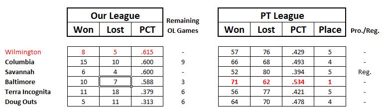 Unfortunately, I missed a series between Wilmington and Savannah due to the fact that the "+" label on those two teams didn't show up for me on my team schedules tables for some reason. Didn't catch it until they actually played the series against each other yesterday. As it turns out then, both teams qualify with more than 10 games, and that changes the makeup of the standings.