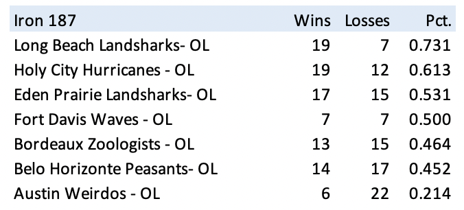 Long Beach has a firm grip on the OL I187 trophy, with Holy City remaining as the only team with a prayer left. The only path left for the Hurricanes would be to sweep the Landsharks in their mid-September 3-game tussle, then take at least 5 of 6 from Eden Prairie. Those three teams remain among the top 4 teams in the entire league.