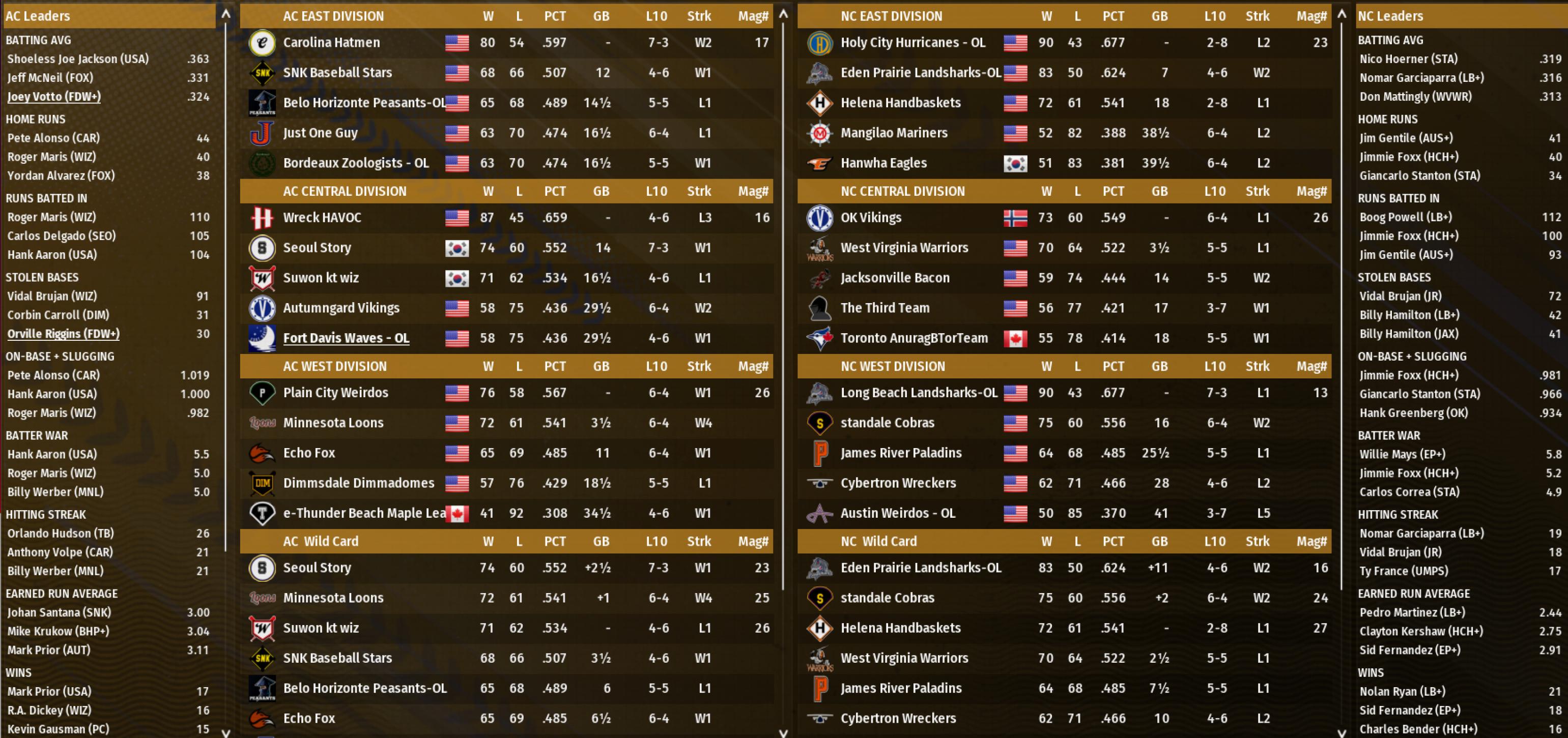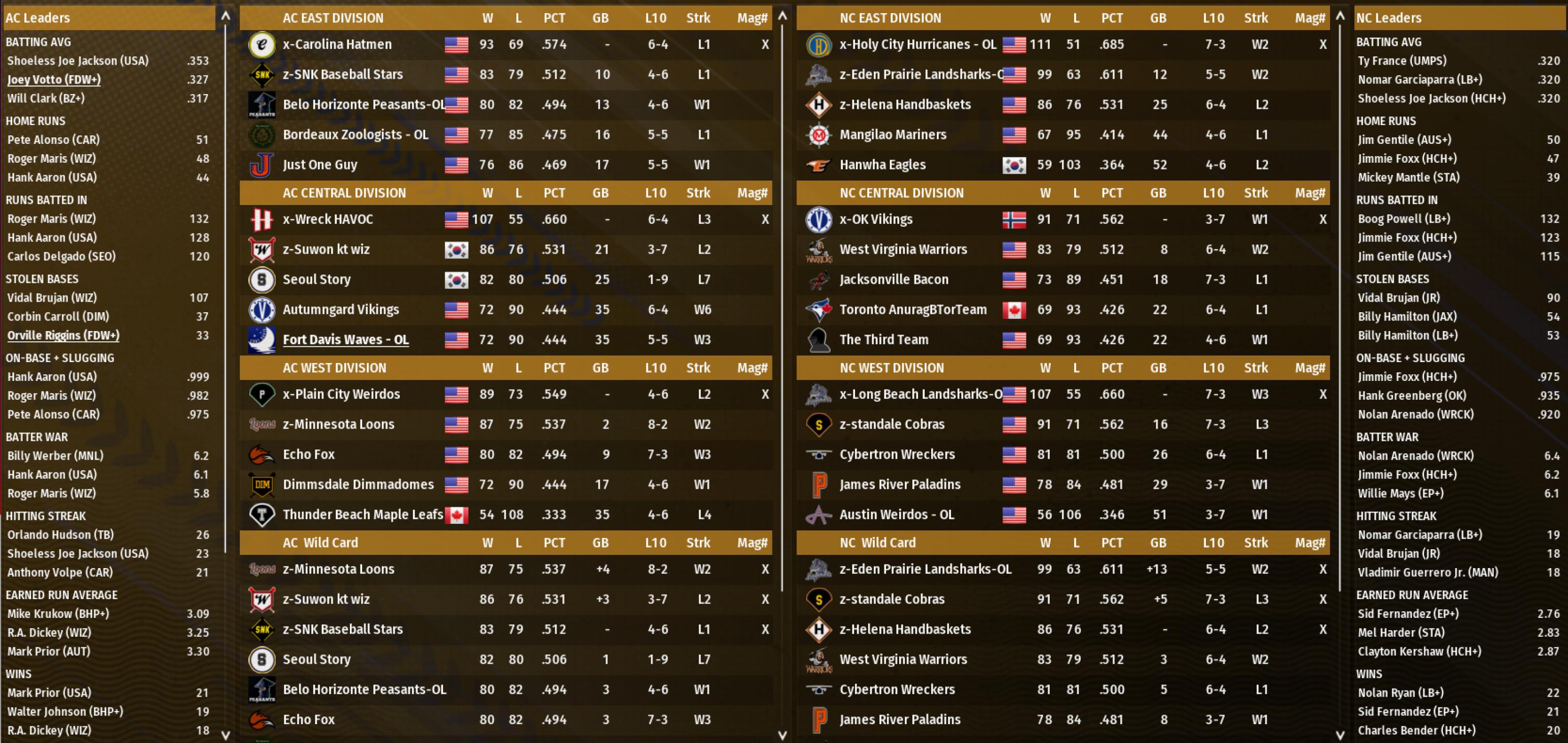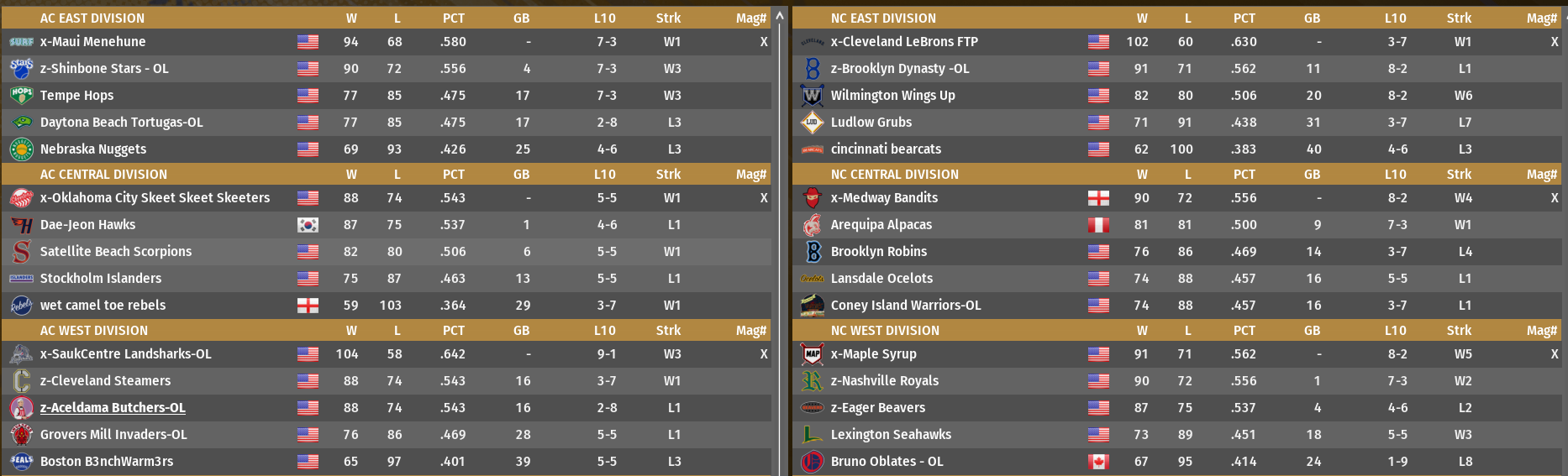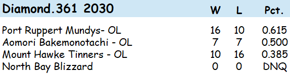 Aomori very quickly confirmed the Mundys as champs, with a tight, low-scoring 3-game sweep of the Tinners. Mount Hawke and Port Ruppert then split their remaining 6 games, which were inconsequential by then, but a chance for the Mundys to play in a carnival atmosphere. Aomori will represent OL in the playoffs, after a fine solid season. Good luck! The rest of us survived, and Mount Hawke kept me guessing in a very odd week. |