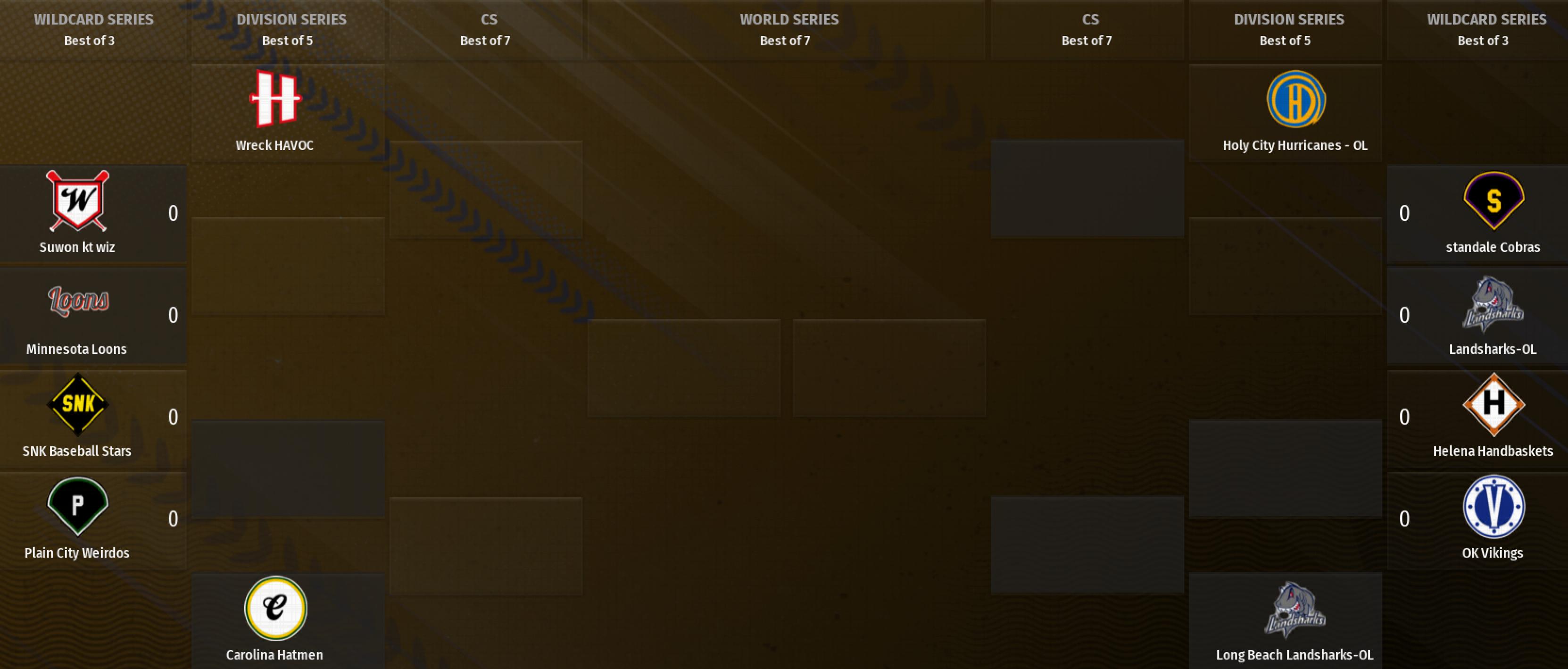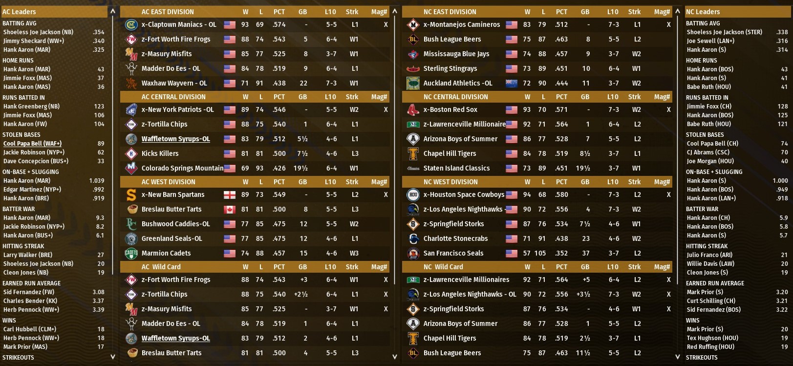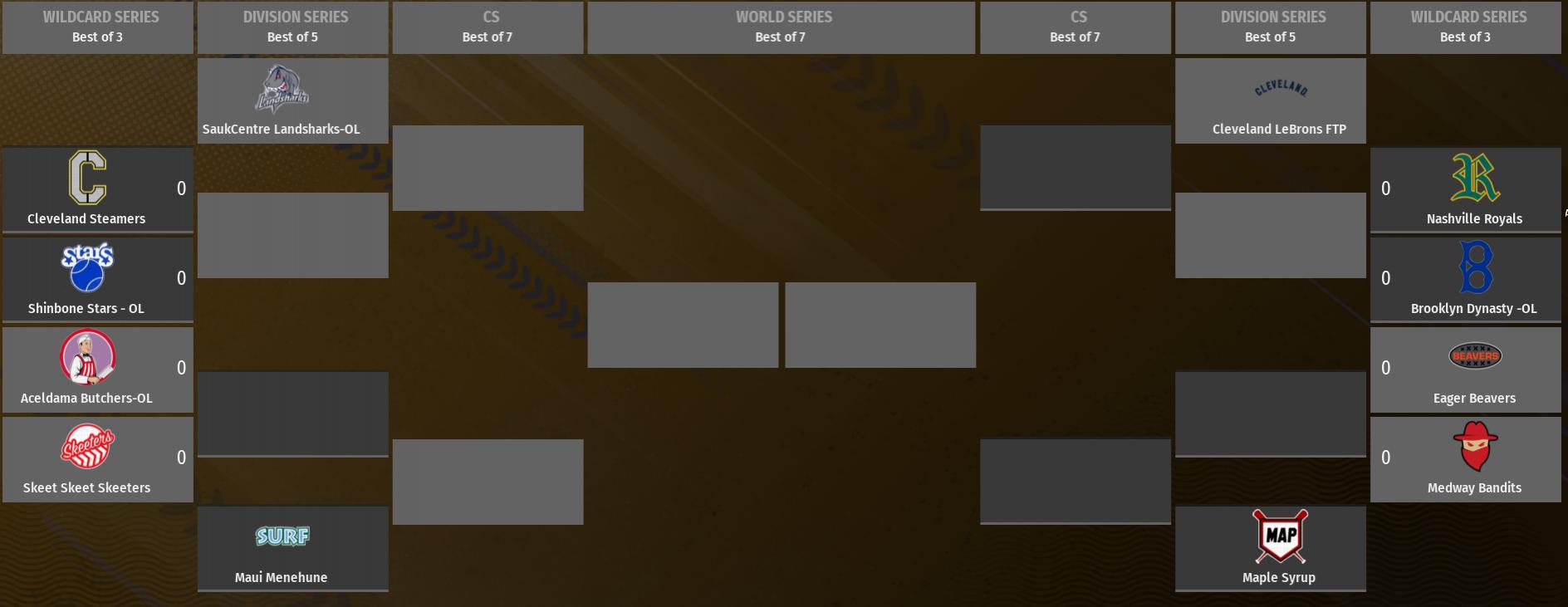 Aomori very quickly confirmed the Mundys as champs, with a tight, low-scoring 3-game sweep of the Tinners. Mount Hawke and Port Ruppert then split their remaining 6 games, which were inconsequential by then, but a chance for the Mundys to play in a carnival atmosphere. Aomori will represent OL in the playoffs, after a fine solid season. Good luck! The rest of us survived, and Mount Hawke kept me guessing in a very odd week. |