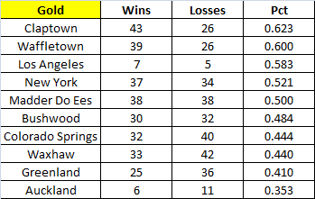 A solid final month for Claptown catapulted them over Waffletown (who had a dismal September run... figures) to claim the OL crown. Overall Claptown, New York, and Los Angeles make the post season. Waxhaw and Colorado Springs will head back to Silver |