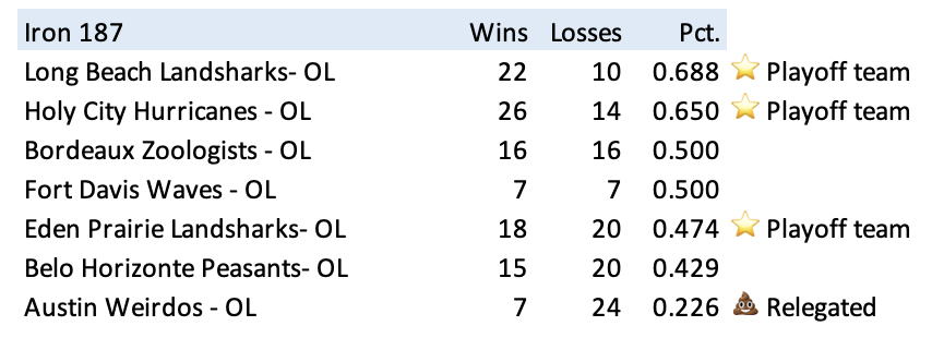 Baltimore grabbed a Wildcard spot in the playoffs, but stands almost no chance to get Promoted. Savannah and Terra Incognita will be relegated to Iron. Last edited by HRBaker; 07-10-2022 at 10:31 AM. |