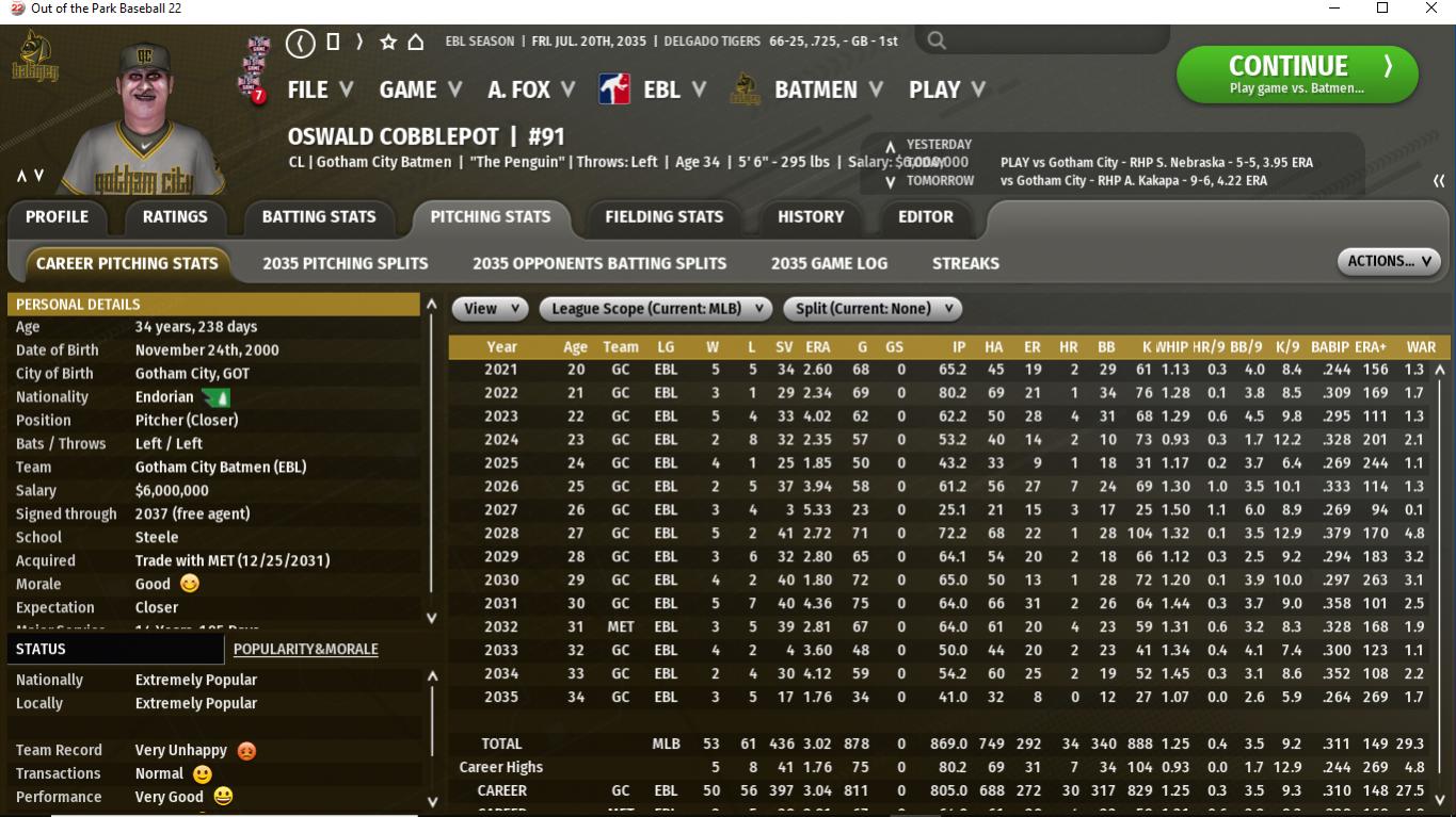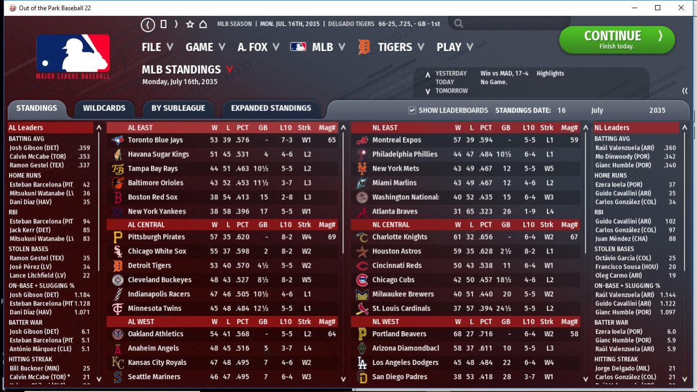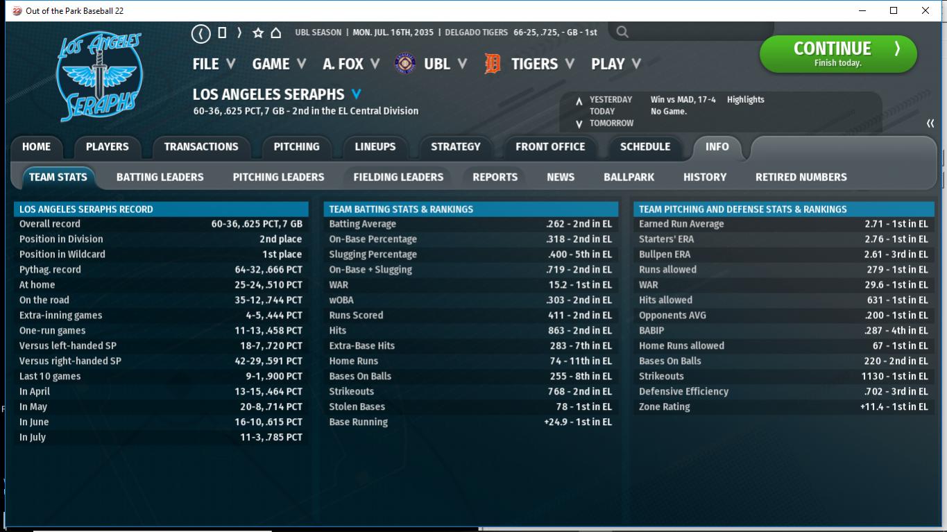 44-47 22 GB AL East We are 8-3 vs Gotham City I changed the rotation around a bit. Mathewson is our #1 now and Johnson moved to #2. Gotham City is in last place but is only 3 games under .500, so they are not that bad. when they get Viruet back, they might be able to pull out of last place.