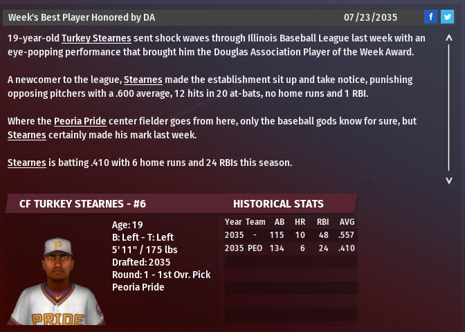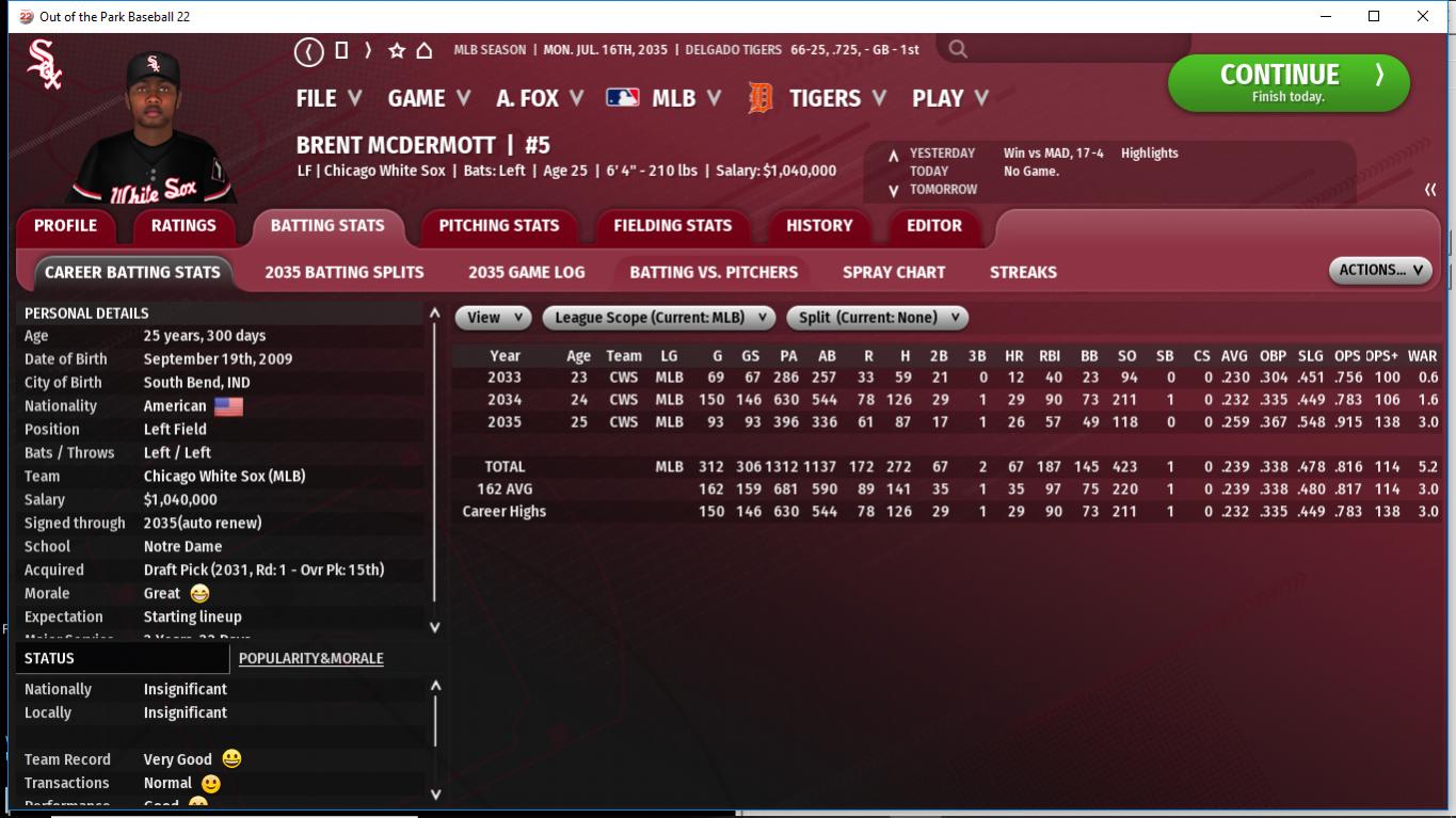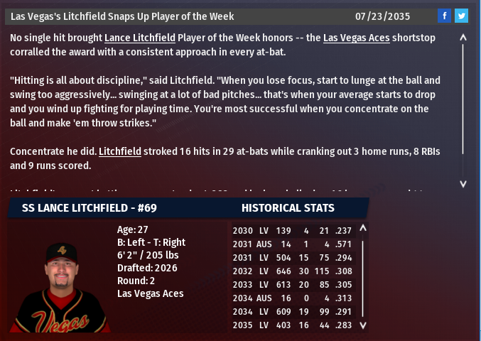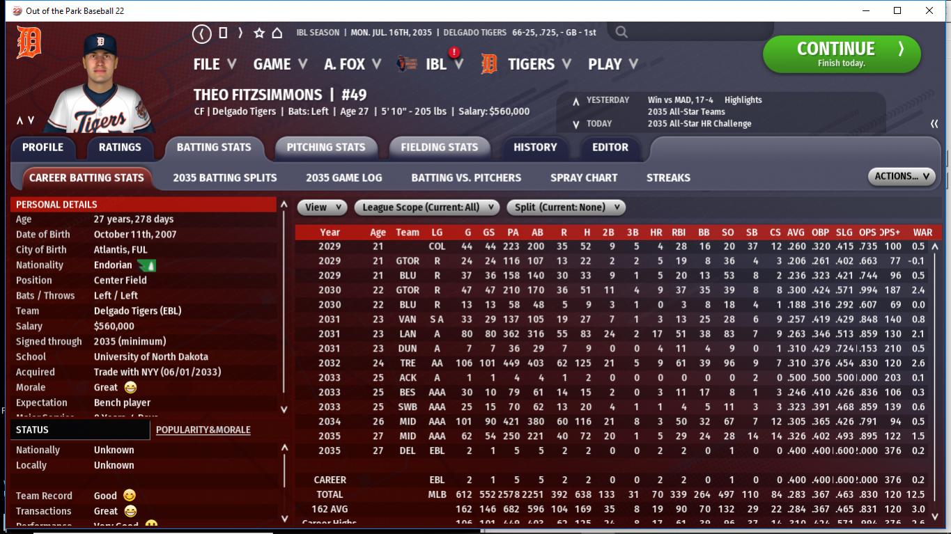 Player Profile CF Theo Fitzsimmons L/L #49 When i acquired Theo from the Yankees, he was our #1 prospect. He has since fallen off the prospect board but has had back to back solid seasons at AAA. He is an above average defensive Cf & RF with plus speed. He can hit for good avewrage but has not shown the power that i thought he might have. He has a shot at OD Cf in 2036 but will have some competition in Kournikova, Russell, Eidsvag & Tarlac. With all the recent injuries both Tim Milton & Samantha Neeley have worked their way into starting roles at AAA.
