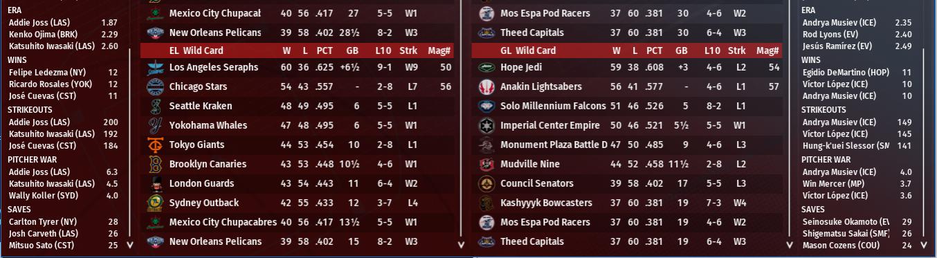 Supermen, Giants, T-Birds/corvettes/Jedi Knights are the NL division leaders. All 3 NL C teams are also tied for NL WC.