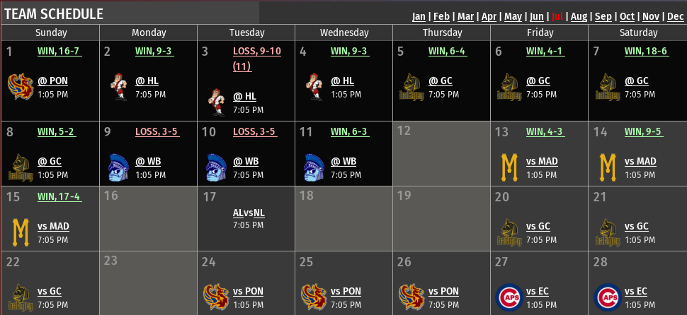 The pitching wasn't great this week, especially vs WB. We swept Madison as we should have. After the ASG we host GC for 3. Lurte & Otani pitched ok . Evans, Kurota, Nokleby, ramos & Jackman all pitched really well.