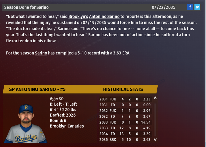Brooklyn loses SP Antonio Sarino for the season. London loses SS Toby Measures for the season.