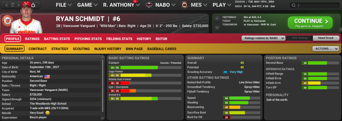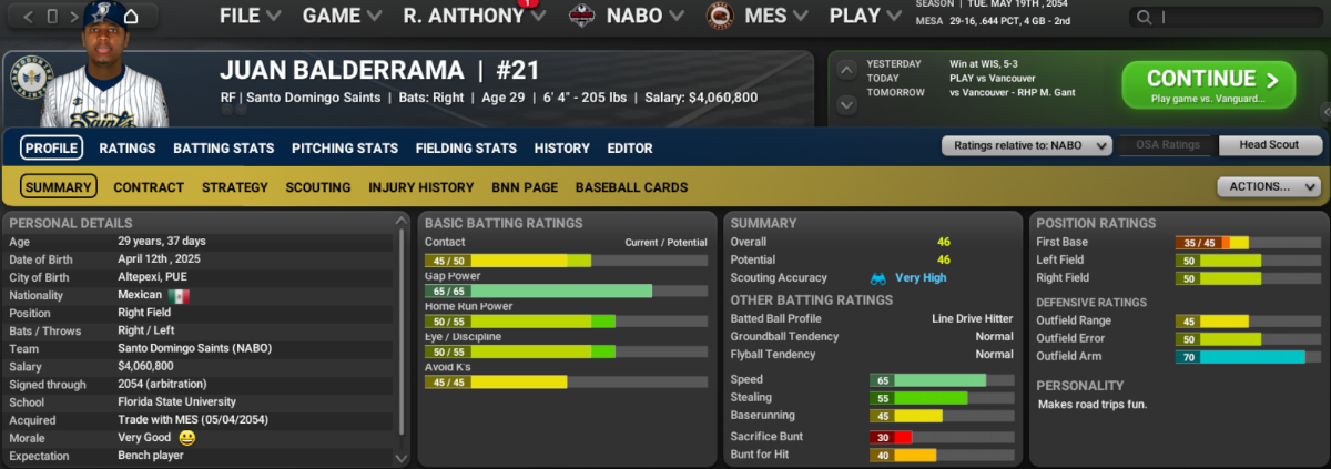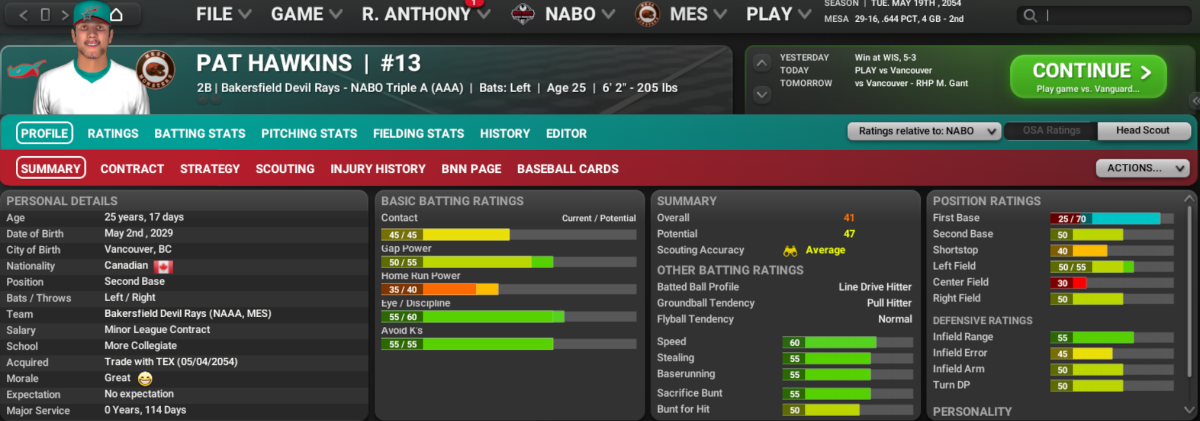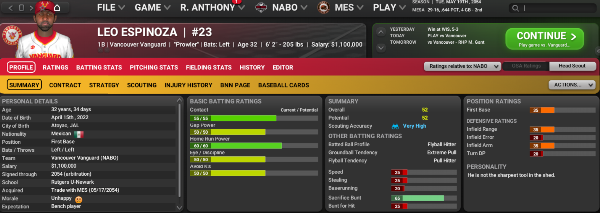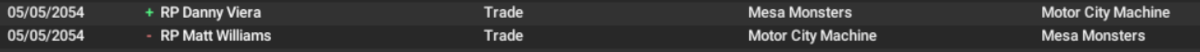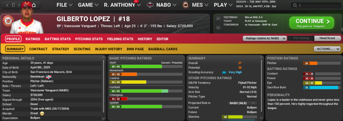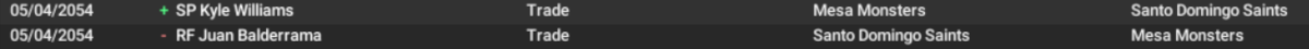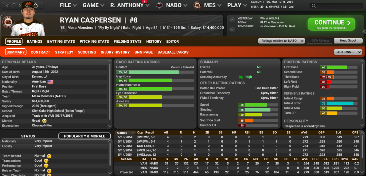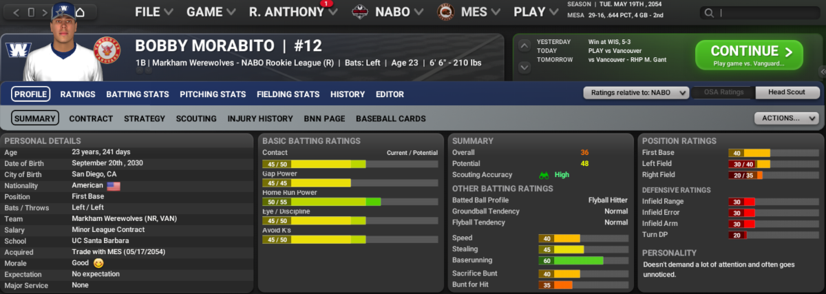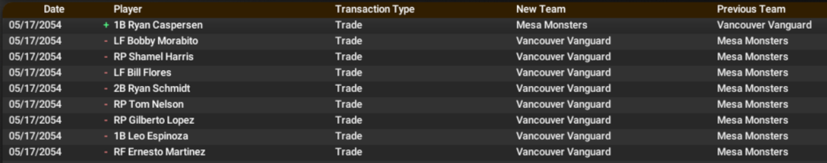![]() ![]() Traded for some 1B help, while players work through their struggles. He's with Mesa for 2 seasons. Threw in extra prospects, including a big one in Martinez, to get Vancouver to retain the bulk of his contract. Mesa gets a starting 1B, Vancouver gets 7 major leaguers on their present roster and 1 minor leaguer. I may regret making this trade, we'll see. I also needed some popularity increase, as my attendance is down despite being high in the standings. ![]() ![]() ![]() ![]() ![]() ![]() ![]()