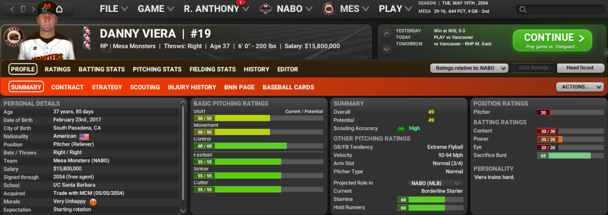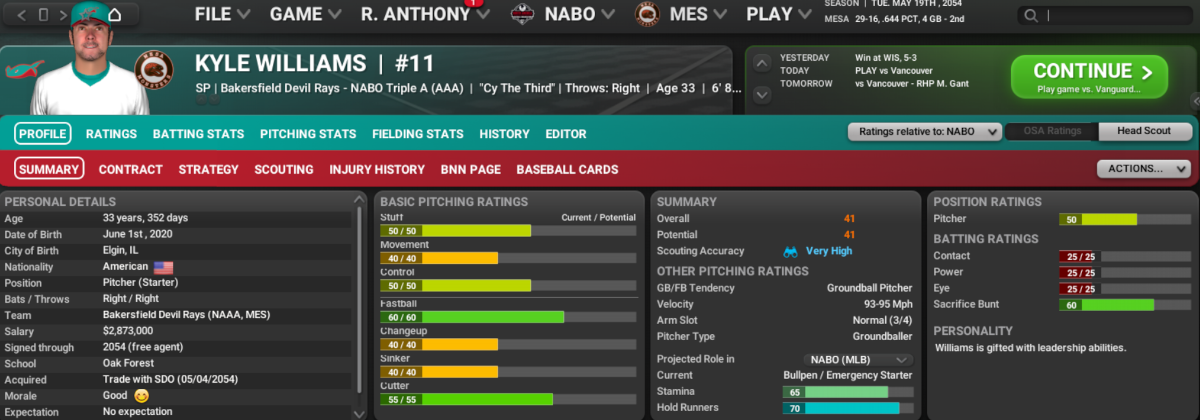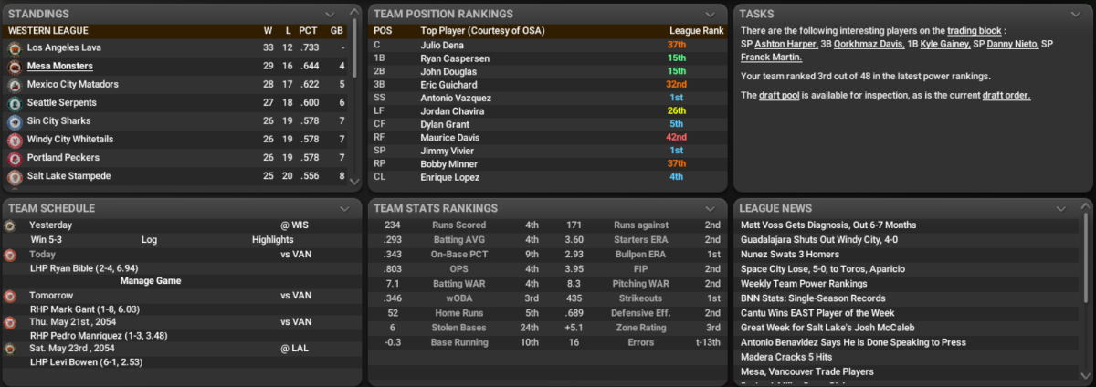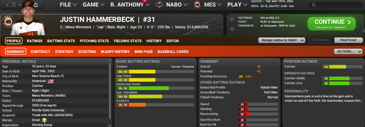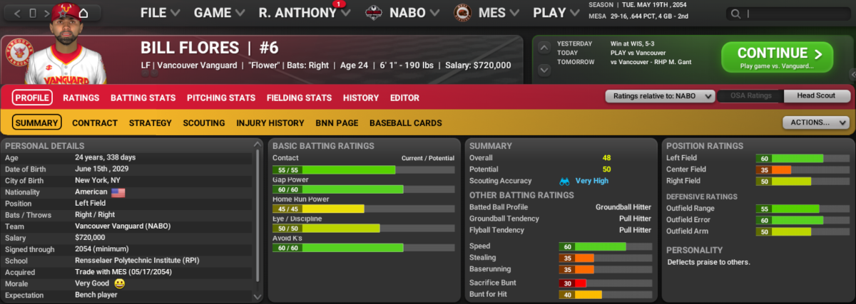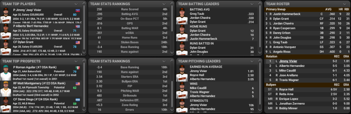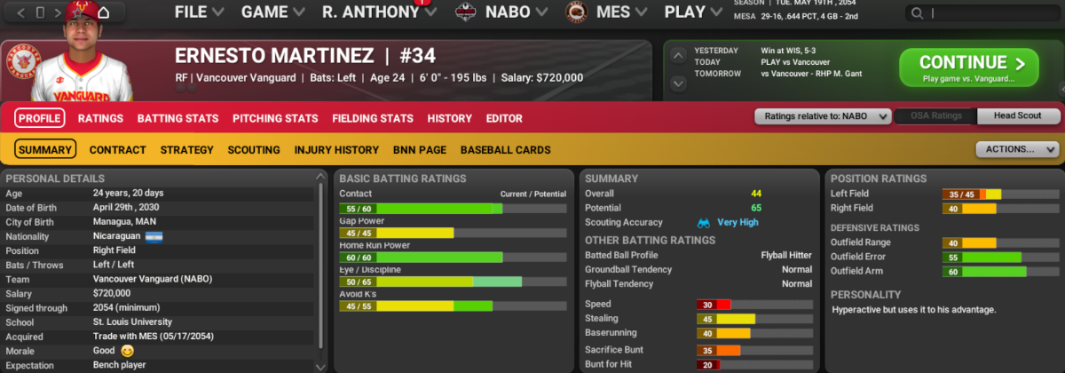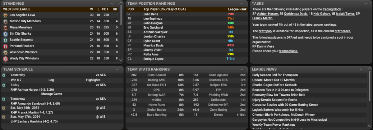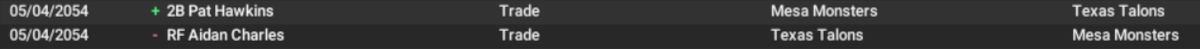 ![]() ![]() Traded for some 1B help, while players work through their struggles. He's with Mesa for 2 seasons. Threw in extra prospects, including a big one in Martinez, to get Vancouver to retain the bulk of his contract. Mesa gets a starting 1B, Vancouver gets 7 major leaguers on their present roster and 1 minor leaguer. I may regret making this trade, we'll see. I also needed some popularity increase, as my attendance is down despite being high in the standings. ![]() ![]() ![]() ![]() ![]() ![]() ![]()