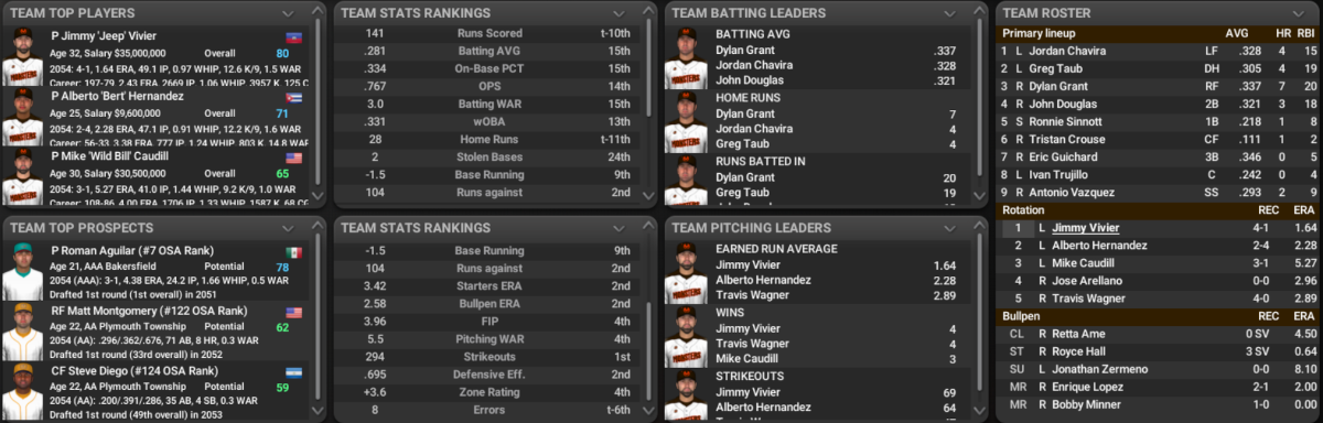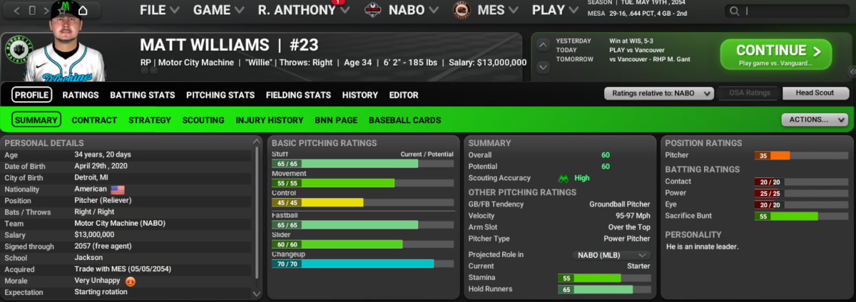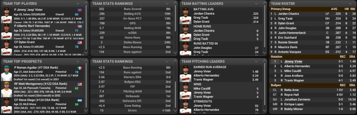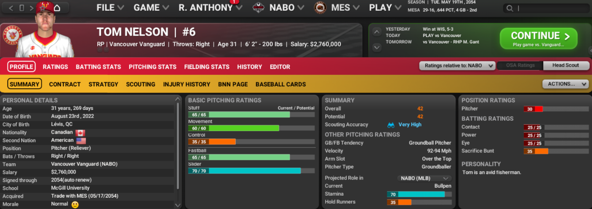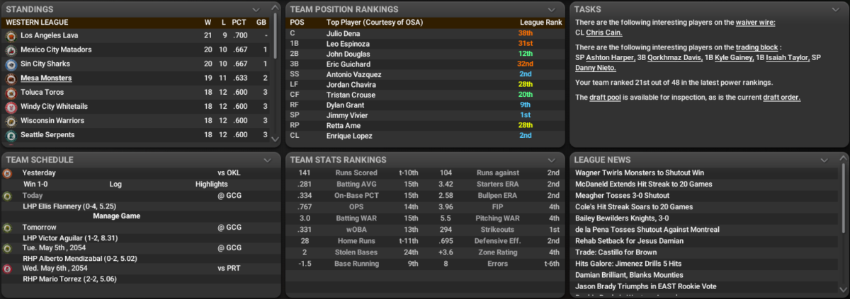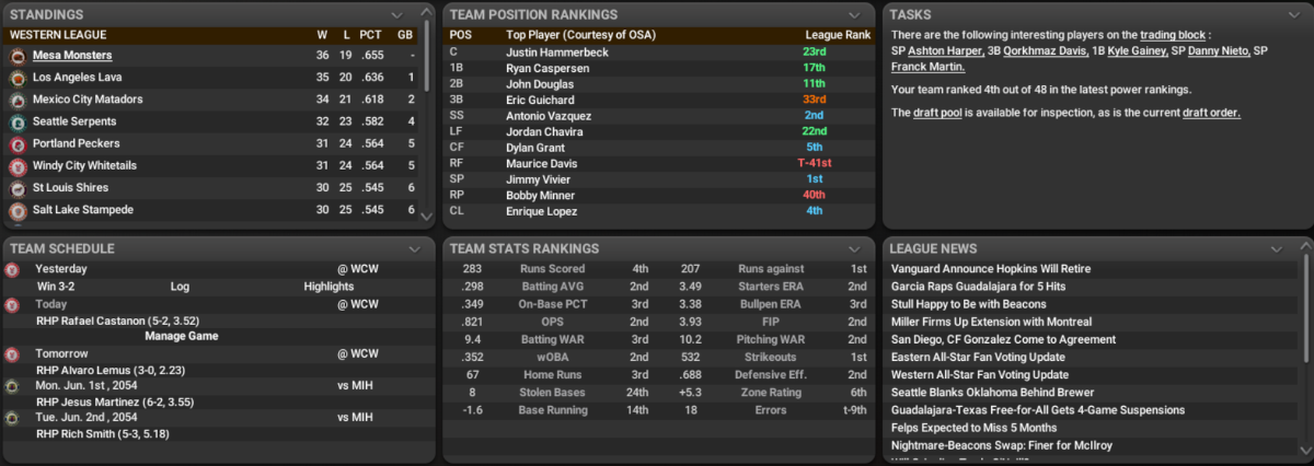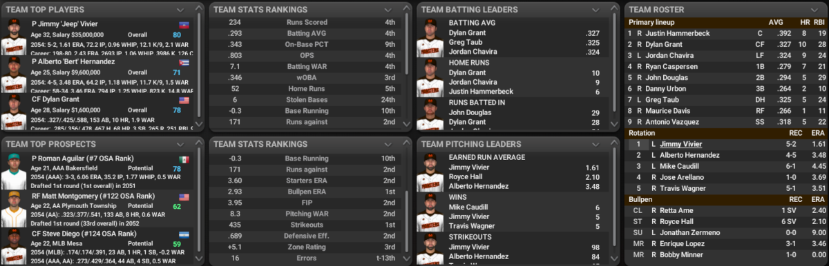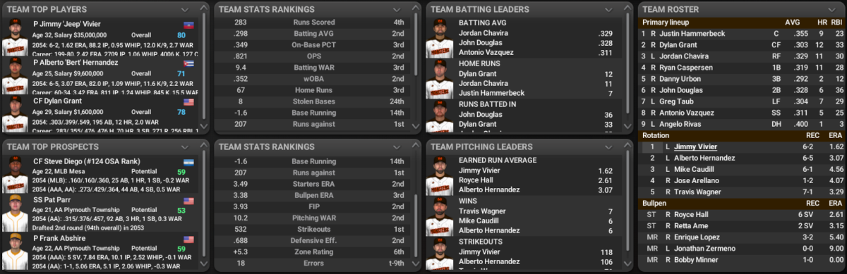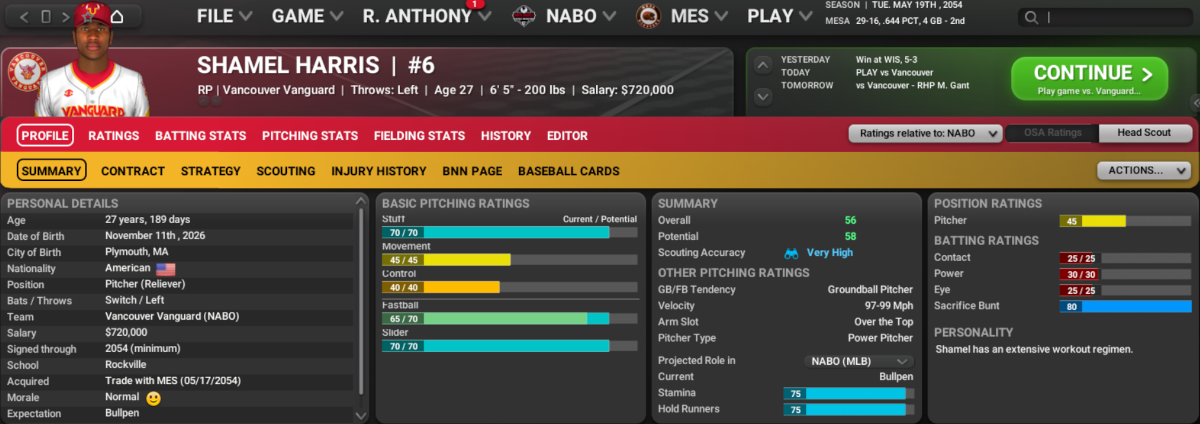 ![]() ![]() Traded for some 1B help, while players work through their struggles. He's with Mesa for 2 seasons. Threw in extra prospects, including a big one in Martinez, to get Vancouver to retain the bulk of his contract. Mesa gets a starting 1B, Vancouver gets 7 major leaguers on their present roster and 1 minor leaguer. I may regret making this trade, we'll see. I also needed some popularity increase, as my attendance is down despite being high in the standings. ![]() ![]() ![]() ![]() ![]() ![]() ![]()