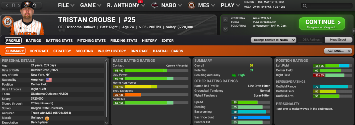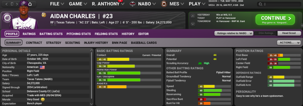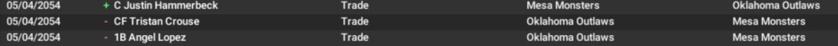 ![]() Traded for an upgrade in platoon/starting catcher. 2y left on his deal. Got Oklahoma to retain all but 4.4M/y. That should give me time to decide if he's worth extending or to land something in the draft. ![]() ![]() Had to give up a good CF prospect. But, I've been collecting OF prospects for the last 4 drafts, preparing for OF to leave in FA. ![]() No place for him to play, and it frees up some overall money. |