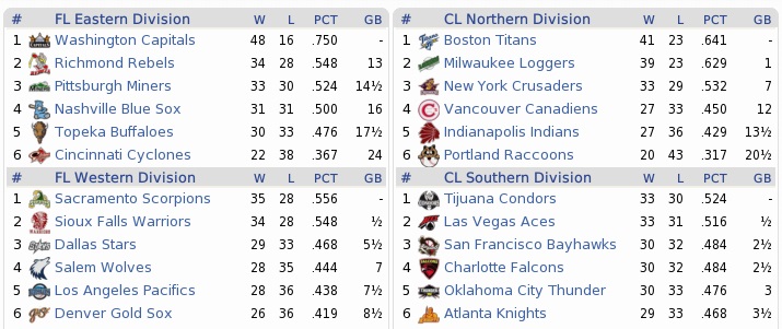 Here was another team suffering from a horrid (10th in CL) rotation, but the Condors had sufficient offense to stay atop the CL South at this junction. They also possessed the best bullpen with a 2.71 ERA to those arms. Since being traded a bit over a month ago, Ben O’Morrissey had hit five home runs for them. Of course he had. Projected matchups: Scott Wade (4-5, 5.30 ERA) vs. Jose Maldonado (2-5, 4.13 ERA) Miguel Lopez (7-6, 3.67 ERA) vs. Woody Roberts (10-6, 2.41 ERA) Hector Lara (2-4, 4.18 ERA) vs. Juan Lara (10-7, 4.31 ERA) We were starting a string of 17 games without an off day with this series. These three guys were all right-handers, but we will be looking for opportunities to rest Brewer and Wedemeyer against left-handers, and Reece against right-handers starting on the weekend. These three are the only two players that really play every game at the moment. Game 1 TIJ: 2B Boyle – 1B C. Guzmán – RF Wales – LF Horn – 3B O’Morrissey – CF Gorden – SS Solís – C F. Ramirez – P Maldonado POR: 2B Brewer – 3B Crowe – CF Reece – 1B Wedemeyer – RF Green – LF Kinnear – C Aycock – SS Caddock – P Wade Once again, Wade was just too easily hittable. O’Morrissey had his 100th hit of the year with a leadoff single in the second, which was soon followed by Rory Gorden’s 12th homer of the season, and the Condors were 2-0 ahead. While Wade recovered from that hiccup, although he wasn’t pitching his usual game, striking out seven while surrendering tons of hard contact, the Raccoons hit into double plays in the second, third, and fourth innings, and then stopped getting on base at all. Wade completed eight innings, and then was hit for with two runners on base and one out in the bottom 8th. Buell grounded out, and so did Brewer, and so they went down once more, but not without leaving the tying runs on base in the ninth as well. 2-0 Condors. Wade 8.0 IP, 5 H, 2 R, 2 ER, 1 BB, 7 K, L (4-6); So, by now we can safely assume that Scott Wade will not continue his 11-year run of winning double digit games. Thanks for some ****ty offense for the most part. Game 2 TIJ: 2B Boyle – SS Gorden – RF Wales – LF Horn – 1B O’Morrissey – C Lozano – CF Spinelli – 3B Liang – P Roberts POR: 2B Brewer – 3B Ingall – CF Reece – 1B Wedemeyer – RF Buell – LF Kinnear – SS Guerin – C Vinson – P M. Lopez The Raccoons mauled Woody Roberts in the second inning. Weeds led off with a single, stole second, and went to third on Buell’s single. Kinnear popped out, but Guerin singled home Weeds. Buell and Guerin then pulled off a double steal, and Vinson struck out. Two down, Lopez came through with a bouncing single into right, plating one run, and then Brewer hit a line drive double to center, getting the score to 4-0. Reece would bring home Brewer before the inning ended with Weeds whiffing. 5-0, now it was on Lopez. After four strong innings, the world turned on Lopez in the fifth, with the Condors having runners on the corners with one out and the pitcher’s spot up. The Condors did not hit for Roberts, who instead bunted the runner from first to second. Lopez then hit Boyle and surrendered a 2-run single to Gorden, walked Wales to reload the plates, and then was lucky to escape when Martin Horn fouled out. Up 5-2, the Raccoons’ offense was a-snooze, and Lopez was thumped from the game when Chun-mei Liang led off the seventh with a homer, and he walked PH Carlos Guzmán. Zuniga came in to retire Bruce Boyle, and then Miller got the final two outs of the frame with two pitches, and also pitched a quick eighth. Royce Green hit for him in the bottom 8th with the sacks full and one out, and while he grounded out sharply, Buell scored from third and De La Rosa had to defend a 3-run lead in the ninth. Spinelli, Liang, and Raúl Solís were all sat down in order. 6-3 Raccoons. Reece 2-4, RBI; Wedemeyer 2-4; Buell 2-3, BB, 2B; Miller 1.2 IP, 0 H, 0 R, 0 BB, 1 K; That puts Lopez at 8-6 with two months to go. Should we still get a 10-game winner this season? That would be so exciting! (grumpy face) Game 3 TIJ: 2B Boyle – 1B C Guzmán – RF Wales – LF Horn – 3B O’Morrissey – CF Gorden – SS Solís – C F. Ramirez – P J. Lara POR: 2B Brewer – SS Ingall – CF Reece – 1B Wedemeyer – RF Buell – LF Kinnear – 3B Crowe – C Vinson – P H. Lara In the battle of the Laras, which took place under dark skies, the Raccoons did not get a hit off Juan Lara through three innings, but scored an earned run in the bottom 3rd regardless when Vinson walked, Juan Lara went to second on Hector Lara’s bunt, but didn’t get anybody out, and Vinson scored on the next two outs. We didn’t get a hit until the fifth, when Neil Reece came through with a 2-out RBI single, then *ironically* an unearned run, as Hector Lara, who scored the run, had initially reached on an error by O’Morrissey. The ex-Coon would make three errors in this game, 75% of his team’s total. Weeds was then plunked and Buell worked a bases-loaded walk. For those counting, that’s a 3-0 lead on a single hit, and two runs unearned. Such a flurry of dumb luck was certainly making me await punishment, but our Lara made it through seven shutout innings in this game. The skies had opened shortly once in the fifth inning, but then opened for determinately in the bottom 7th, which ended Hector’s day after a 44-minute game delay. But the bullpen held up, and the Raccoons also busted through the highly praised Condors pen in the bottom 8th, including a 3-run homer by Marvin Ingall, to run away with this one. 7-0 Raccoons. Ingall 1-5, HR, 4 RBI; Lara 7.0 IP, 5 H, 0 R, 1 BB, 6 K, W (3-4) and 1-2; Can’t say I was not grinning at Mr. Too-Good-For-This having a true Cam Green Day in the field here. Suck it up princess, your bitching allotment for this year is already used up! As the calendar flipped over to August, we pulled MR Andres Otero (anyone remember him!?) from the disabled list and 