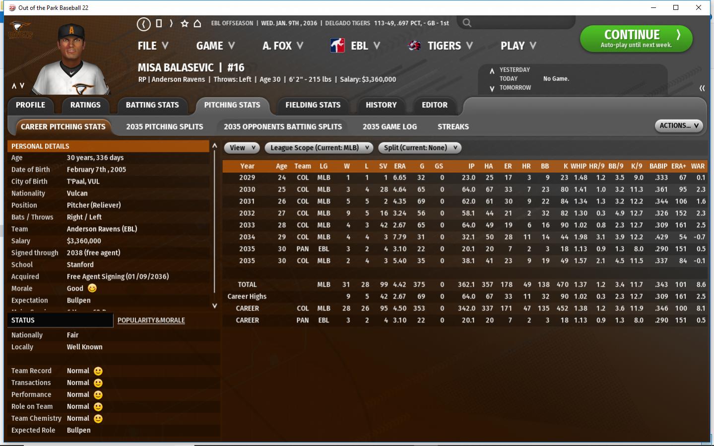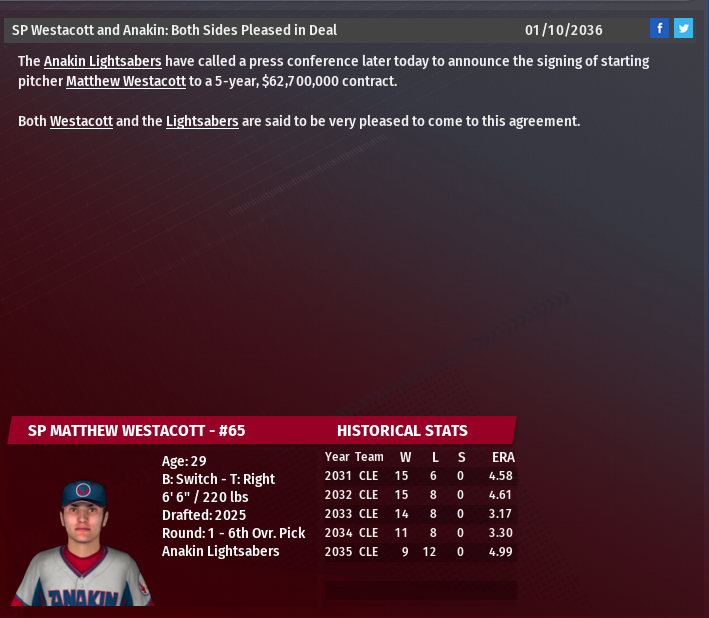 Realignment of 2 subdivisions per league. Structure to be announced February 1st 2036. new expanded playoffs and format. 8 teams will make the playoffs from each league 1 v 8, 2 v 7, 3 v 6, 4 v 5 best of 3 Wildcard Round, 2nd round - League division series will be best of 5. LCS will be best of 7 and World Series best of 7. Notable retired players: Cf Shawn Hanson 1b Jorge Leal Lf/1b Stan Ross Cf Yasushi Ito