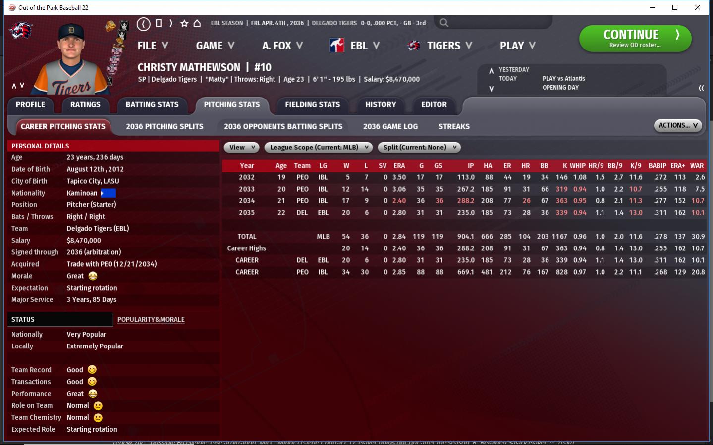 We currently have no $$ for extensions so Young, Kornikova, Mathewson & Johnson will all go to arbitration. Lurte & Thomason are our only FA. Doubtful either will return for 2037. We have the 6th best minor leagues. Top prospect is Cf Tigris DEGaulle. He is slated to be OD CF 2037. SP Eddie Cicotte could be in the rotation as early as 2037.