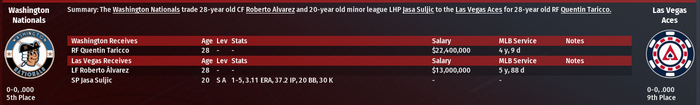Washington Nationals traded Lf Roberto Alvarez & a minor league SP to the Las Vegas Aces for Rf Quentin Taricco.